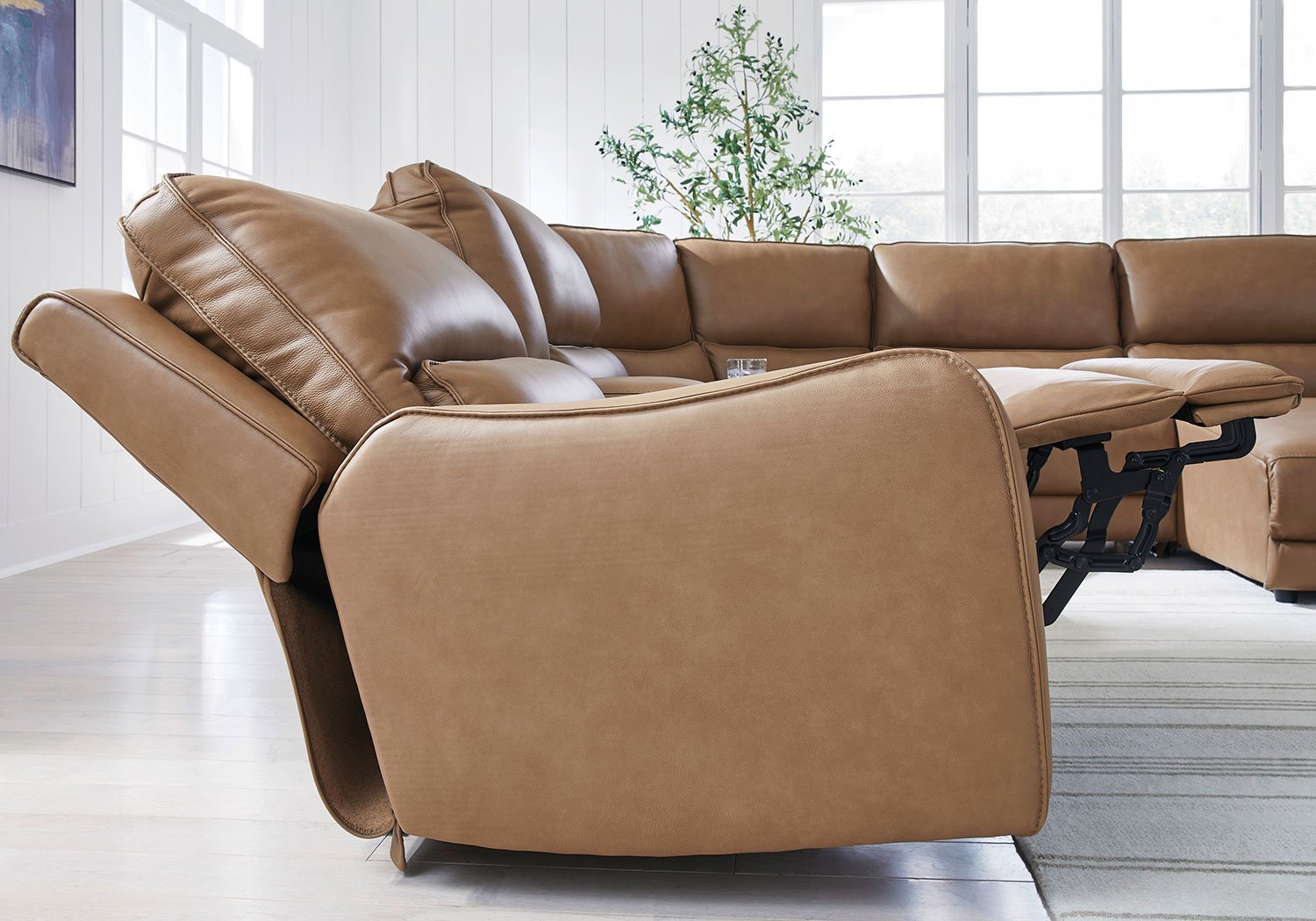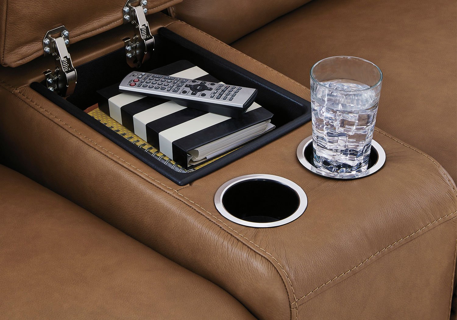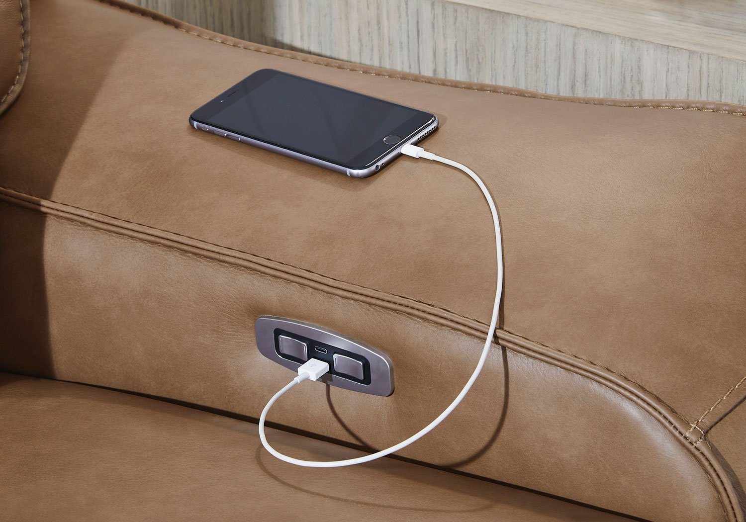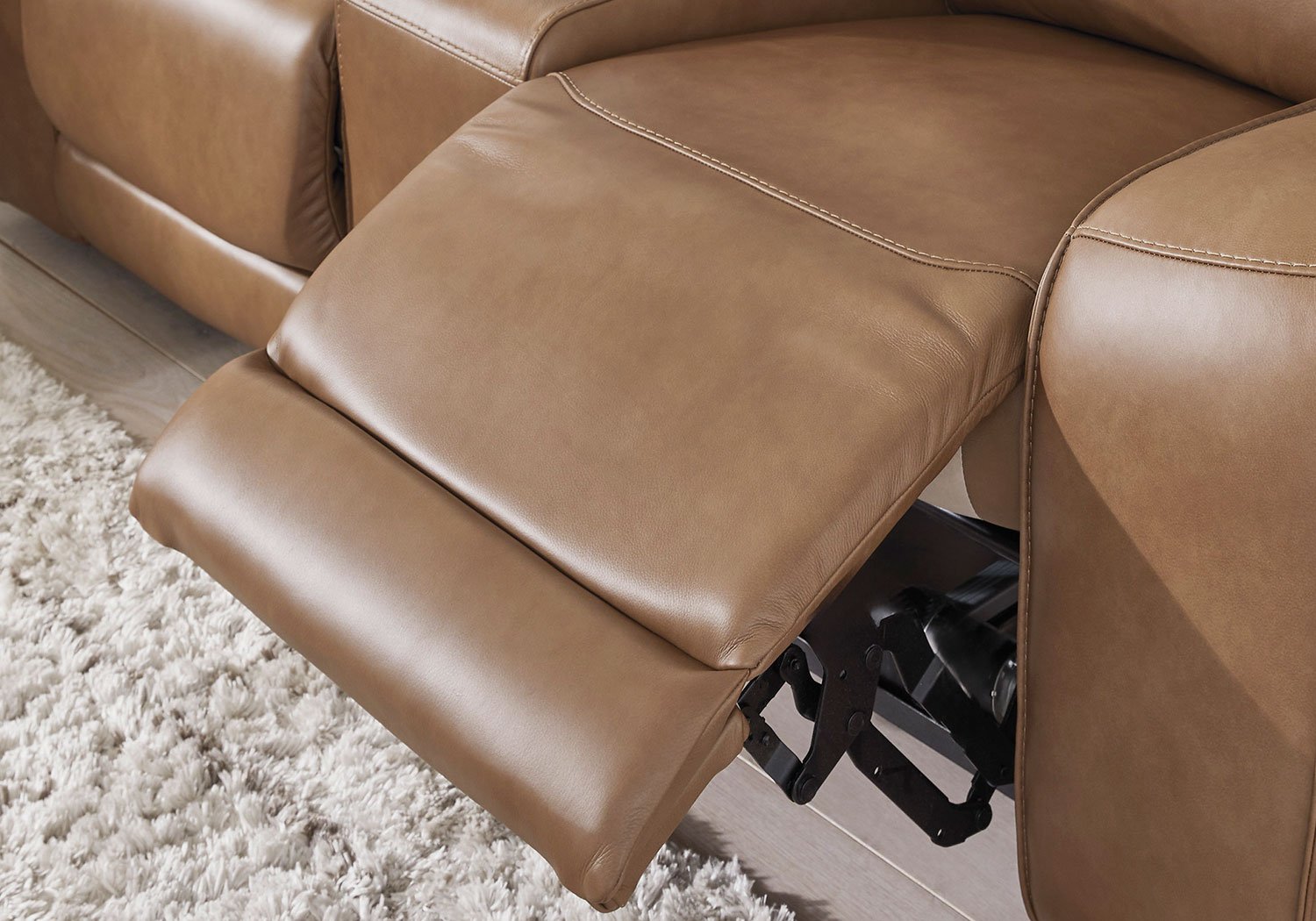 Live and lounge luxuriously. This power reclining sofa brings an ultra-stylish flair to your home’s central hub. Its seating area is wrapped in top-grain leather in a rich caramel coloration, giving you a trend-right look made all the better with high-quality materials. And with the simple push of a button, you can recline or adjust the headrests to find your ideal comfort position.