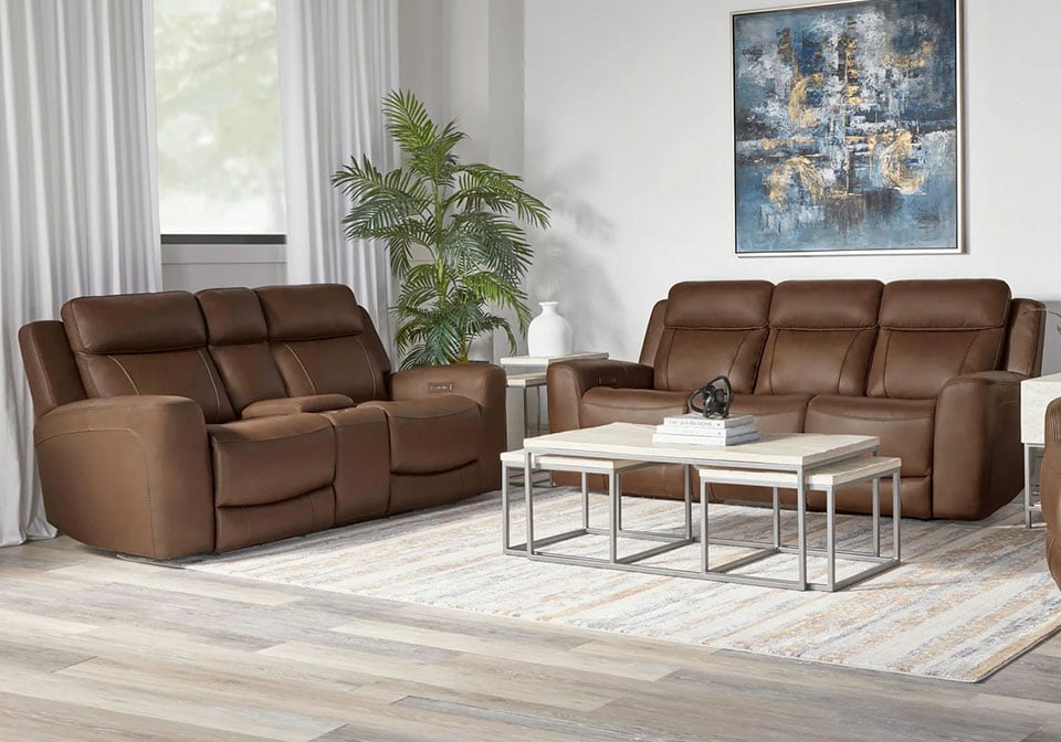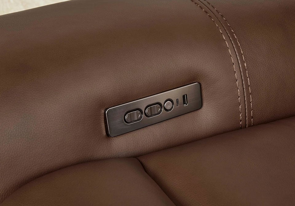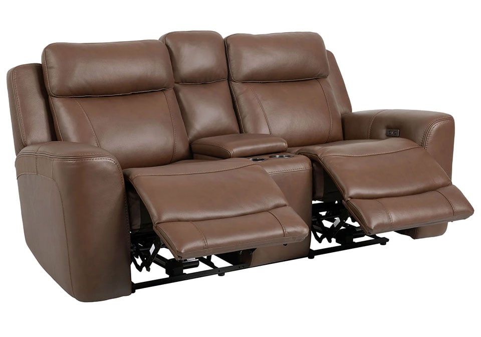 Upholstered in smooth, in Genuine leather. Power recline & power headrests (P2 functionality). Deep, supportive seating with plush armrests and back cushions. Built-in center console with cup holders and hidden storage. Sleek modern design with a neutral tone that suits any décor. Ideal for media rooms, living rooms, and open-concept spaces. Due to its natural origin, real leather can show individual characteristics such as healed scars, growth marks, grain variation and shade variation. Natural variations make each hide unique and do not detract from the wearing qualities of leather.
