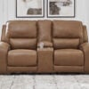 Live and lounge luxuriously. This power reclining sofa brings an ultra-stylish flair to your home’s central hub. Its seating area is wrapped in top-grain leather in a rich caramel coloration, giving you a trend-right look made all the better with high-quality materials. And with the simple push of a button, you can recline or adjust the headrests to find your ideal comfort position.