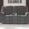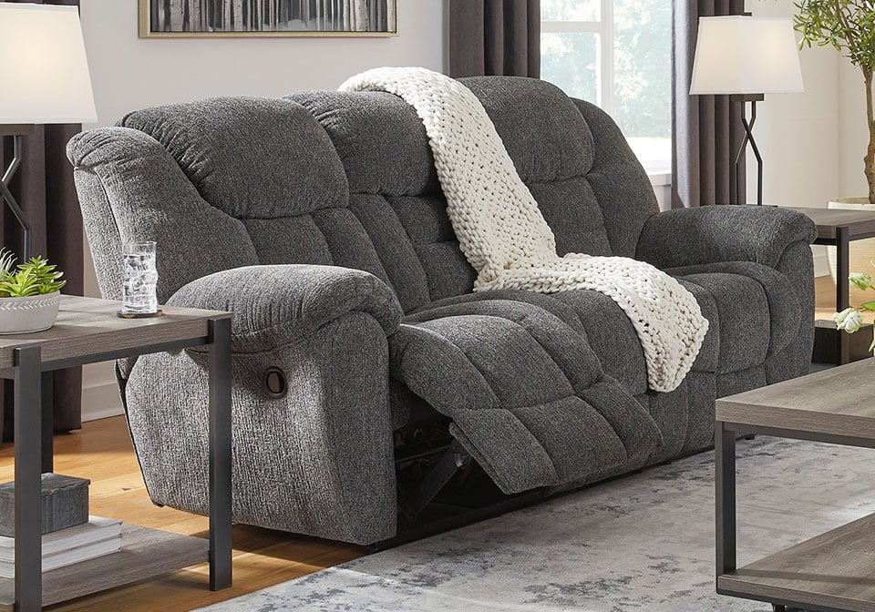 Pull tab reclining motion. Corner-blocked frame with metal reinforced seat. Attached back and seat cushions. High-quality foam cushions wrapped in poly fiber. Polyester upholstery. Next-Gen Nuvella is a performance fabric that is soft, easy to clean, stain-resistant and durable.