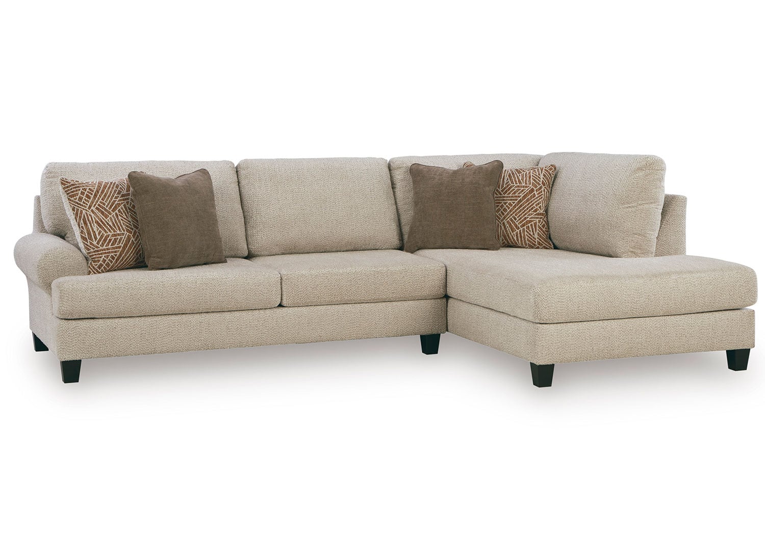 This sectional with chaise incorporates a fresh, transitional feel into your decor. Generously padded seats and super-soft chenille fabric in a versatile neutral invite you to sink in and relax. And the reversible back cushions are easy to flip and fluff when you need a refresh. Finished with a classic roll arm design and stylish accent pillows, this seating set effortlessly suits casual spaces.