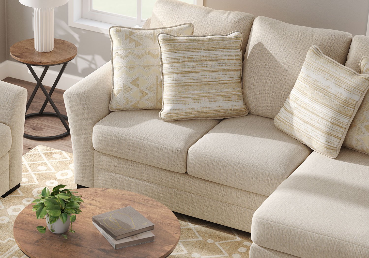 Corner-blocked frame. Reversible back and seat cushions. High-quality foam cushions wrapped in poly fiber. Chaise can be positioned on either side (thanks to reversible chaise cushion and movable ottoman). Pillows with soft polyfill. Polyester upholstery. Next-Gen Nuvella is a performance fabric that is soft, easy to clean, stain-resistant and durable. Easy-to-remove zippered covers for machine washing. Clean fabric with mild soap and water, let air dry; for stubborn stains, use a solution of 4 oz. bleach to 28 oz. water. Low-profile accent legs with faux wood finish. Platform foundation system resists sagging 3x better than spring system after 20,000 testing cycles by providing more even support. Smooth platform foundation maintains tight, wrinkle-free look without dips or sags that can occur over time with sinuous spring foundations.