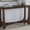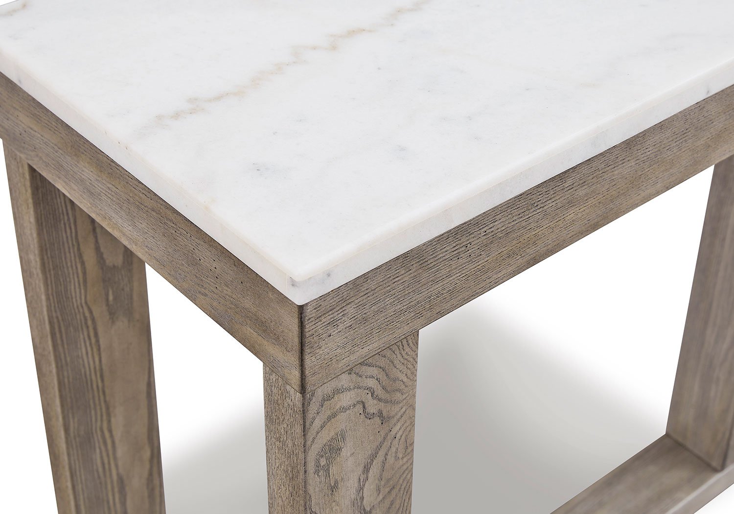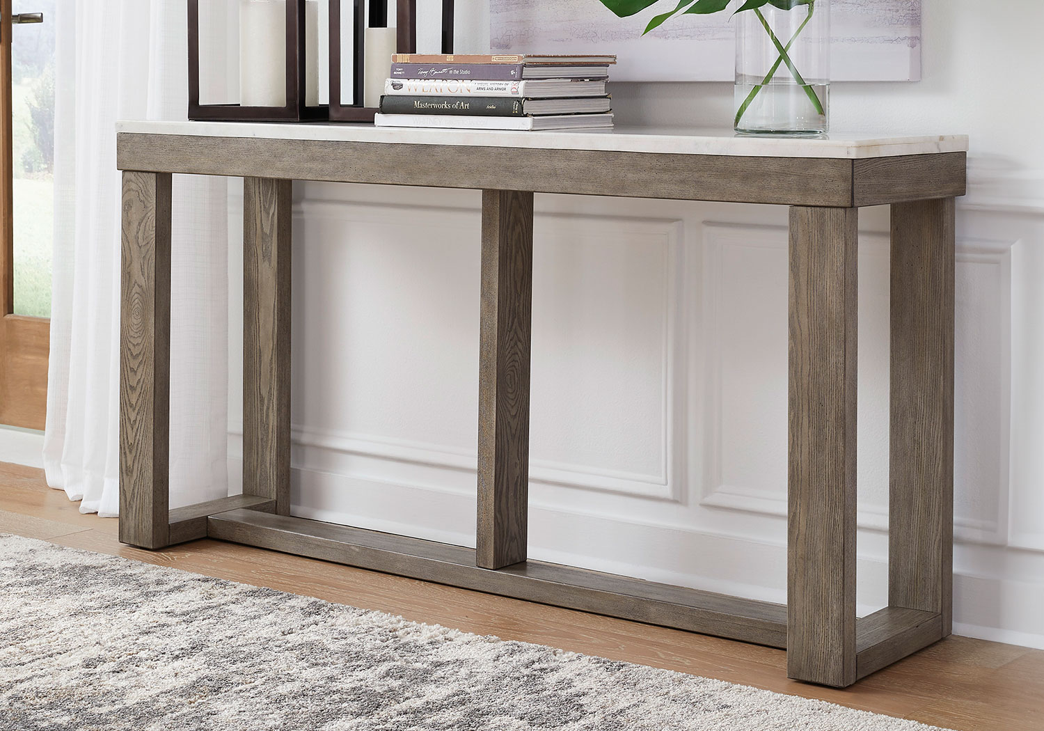 This sofa table is simple in design but big on style. Finished with a trend-right grayish brown wood tone, its bold, blocky profile and natural marble top are timeless, classic choices. This table is ideal for pairing with an ottoman to pull extra seating into the room, or for remaining clean and sleek on its own.