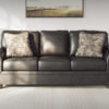 Corner-blocked frame. Attached back and loose seat cushions. High-quality foam cushions wrapped in poly fiber. Pillows with soft polyfill. Faux leather upholstery. Decorative turned legs with faux wood finish. Platform foundation system resists sagging 3x better than spring system after 20,000 testing cycles by providing more even support. Smooth platform foundation maintains tight, wrinkle-free look without dips or sags that can occur over time with sinuous spring foundations.