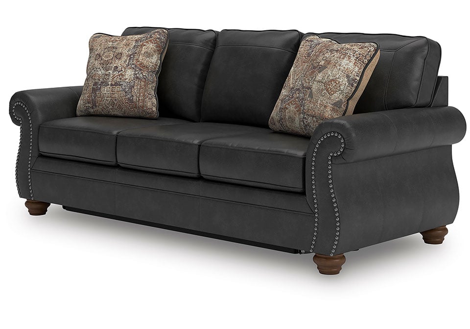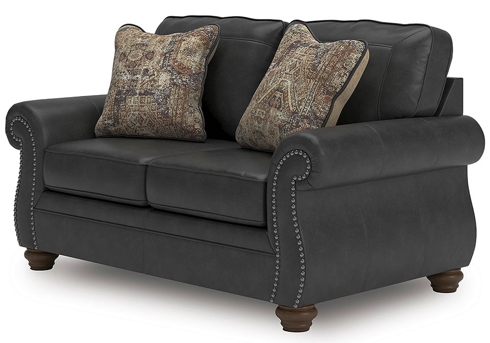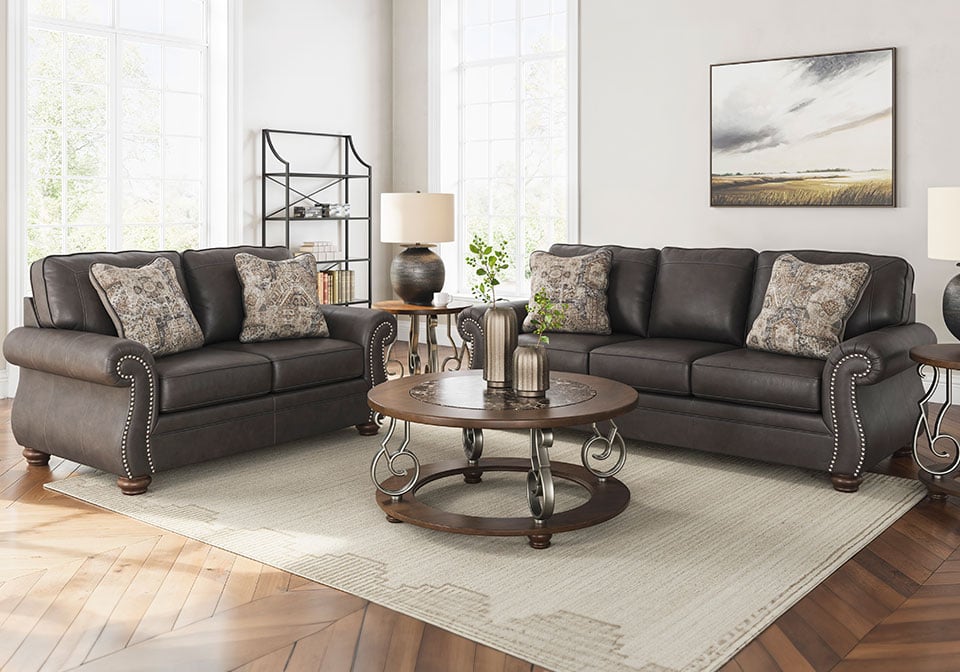 Everyone can have the best seat in the house with this Series. Its nailhead trim puts the finishing touches on the traditional roll arms you love. Comfy, durable cushions—wrapped in a rustic yet sophisticated faux leather—keep you feeling relaxed. Chenille Accents in a distressed motif pattern add another layer of comfort. Turned legs show that style and quality flow from top to bottom.