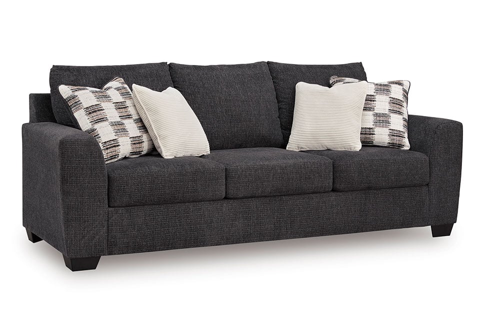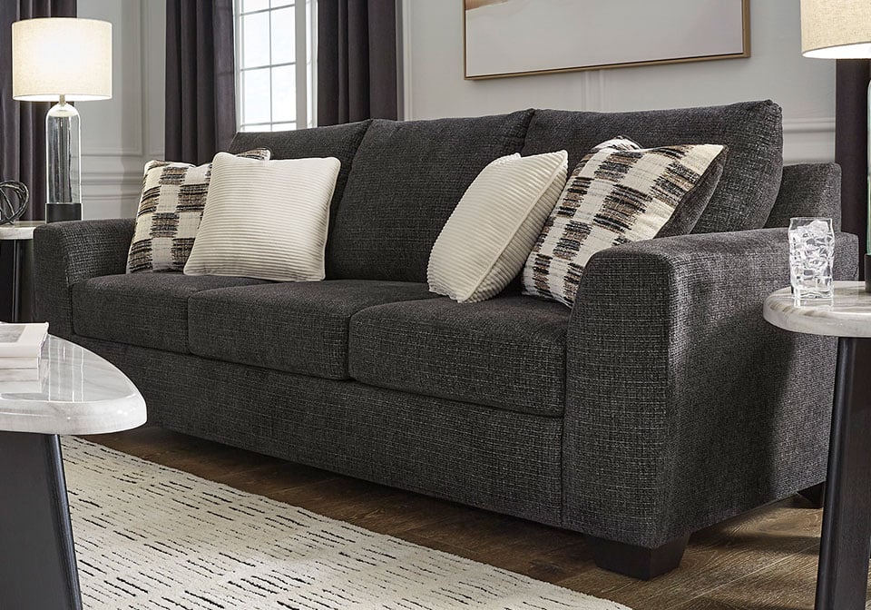 Reinforced frame provides added stability. Attached back and loose seat cushions. High-quality foam cushions wrapped in poly fiber. Pillows with soft polyfill. Polyester upholstery. Exposed feet with faux wood finish. Platform foundation system resists sagging 3x better than spring system after 20,000 testing cycles by providing more even support. Smooth platform foundation maintains tight, wrinkle-free look without dips or sags that can occur over time with sinuous spring foundations.
