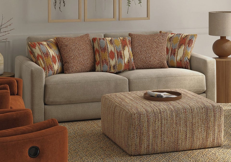 Soft, durable beige fabric upholstery. Clean, modern silhouette with low arms. Plush, deep seating for ultimate comfort. Vibrant, multi-pattern accent designs. Sturdy Steel frame for lasting support. Versatile neutral tones complement any décor.