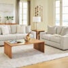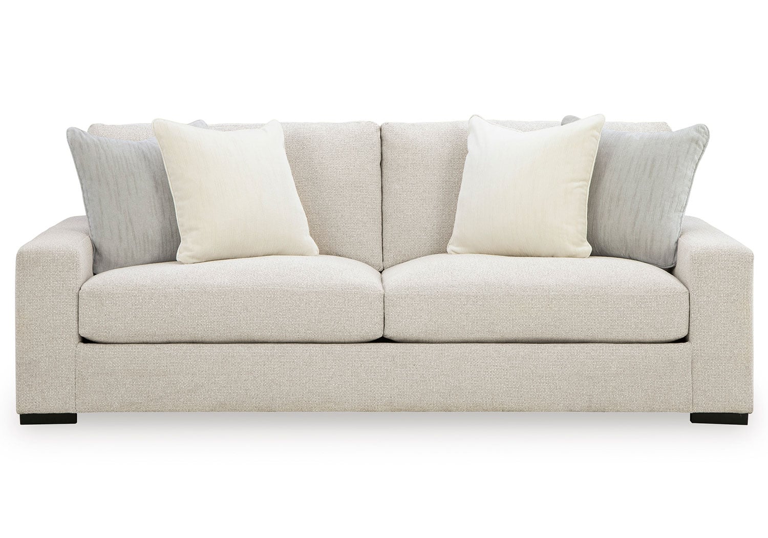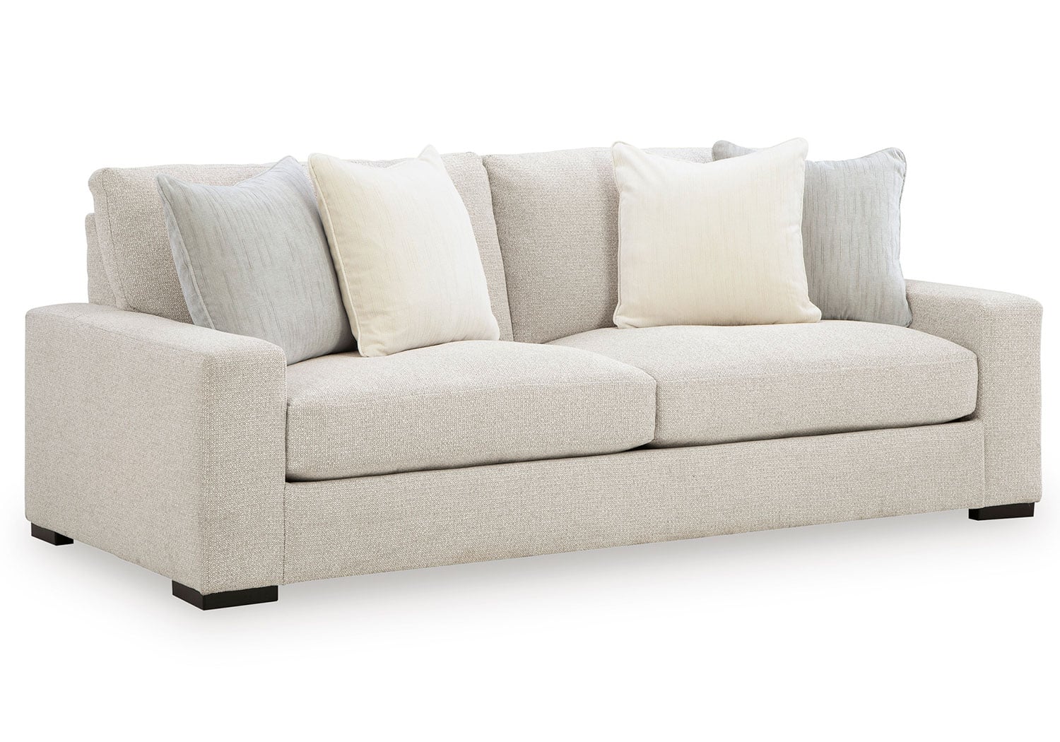 Reinforced frame provides added stability. Reversible seat and back cushions. High-density foam cushions wrapped in feather-fiber blend jacket. Pillows with feather-fiber blend. Polyester upholstery. Non-skid, low-profile accent legs with faux wood finish. Platform foundation system resists sagging 3x better than spring system after 20,000 testing cycles by providing more even support. Smooth platform foundation maintains tight, wrinkle-free look without dips or sags that can occur over time with sinuous spring foundations.
