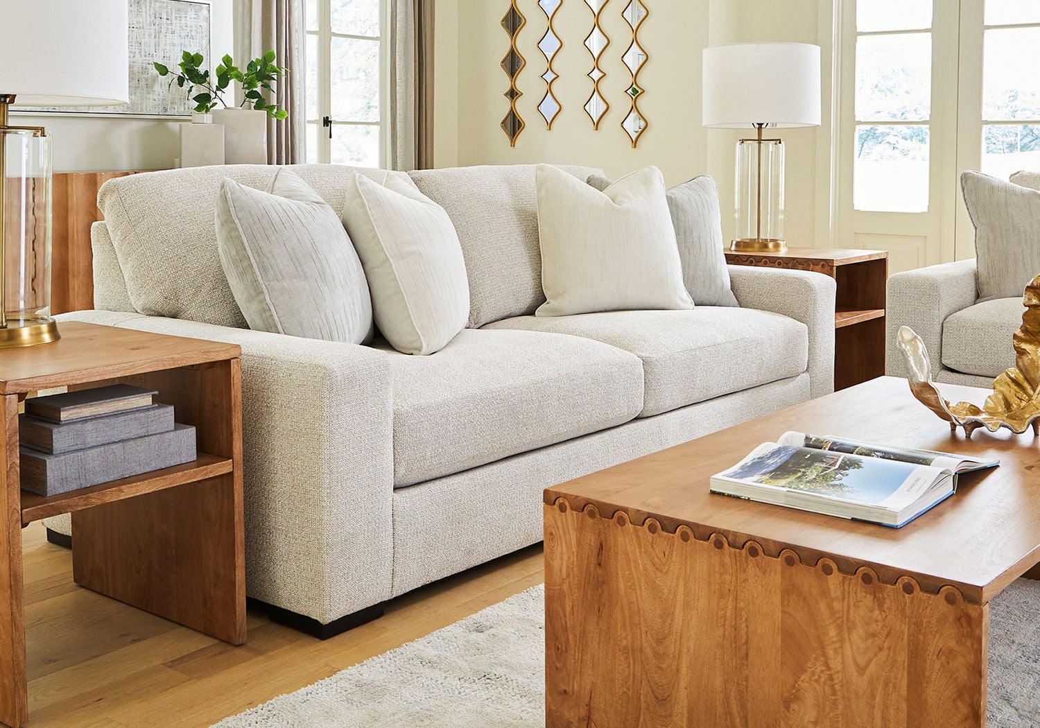 A triumph in transitional design, this Series invites you to indulge in complete comfort. The contemporary yet classically styled piece is covered in oh-so-soft boucle upholstery for a sense of stately sophistication. Decorative velvet pillows in muted hues complete the vibe.