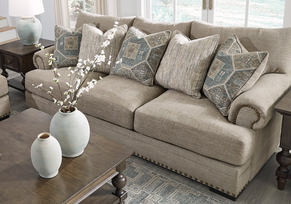 Looking to enhance your home’s visual appeal? This Series offers sophisticated design, comfort and elegance with tonal colors, roll arms and nailhead accents. Enjoy optimal coziness as you nestle into luxurious soft upholstery and feather-blend cushions. Perfect for modern spaces, it’s just the spot to sit back and relax in style.