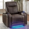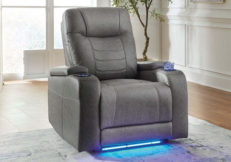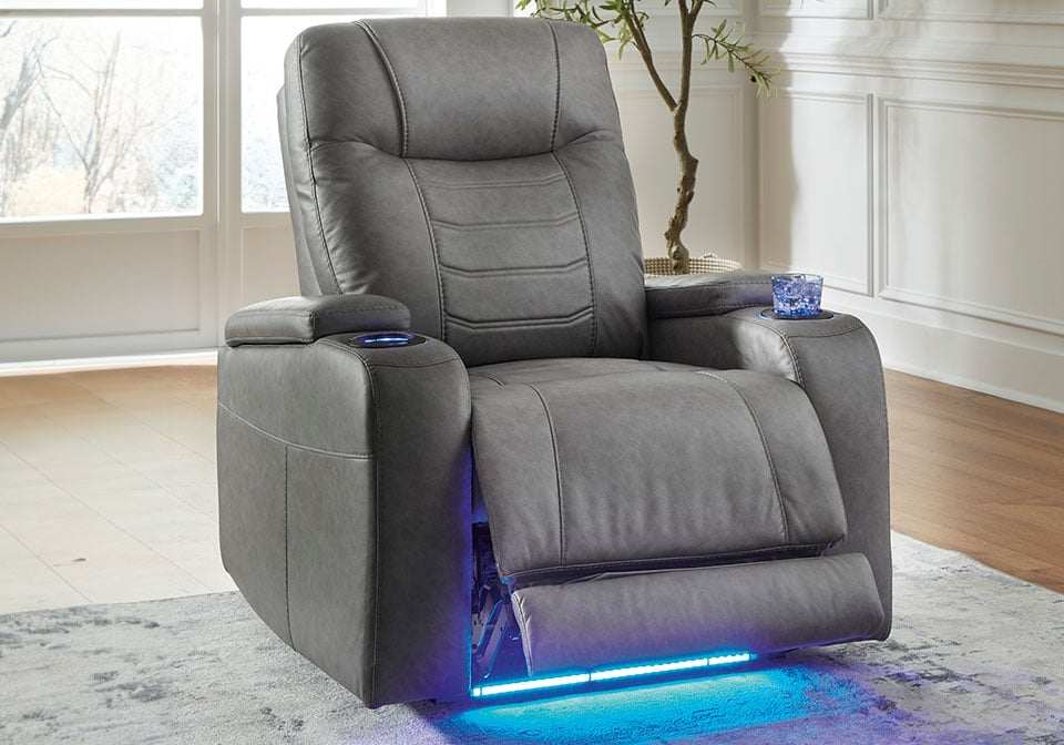 Elevate your movie nights with this power recliner. Its adjustable headrest ensures a perfect view of the TV no matter how far back you recline, and the extended ottoman offers extra space for maximum comfort. Stylish stitching and ambient LED lighting create a theater-style experience. Sit back, relax, and enjoy the show in complete comfort.