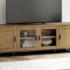 The beauty of this TV stand will immediately engage you. The slight breakfront shape is a rare find and an ideal fit among traditional and eclectic tastes. Soft black undertones highlight the warm finish. Multiple cubbies and glass-door enclosed shelves organize your audio/video components and plenty of extras. Sold separately, an electric fireplace fits neatly in the center cubby.
