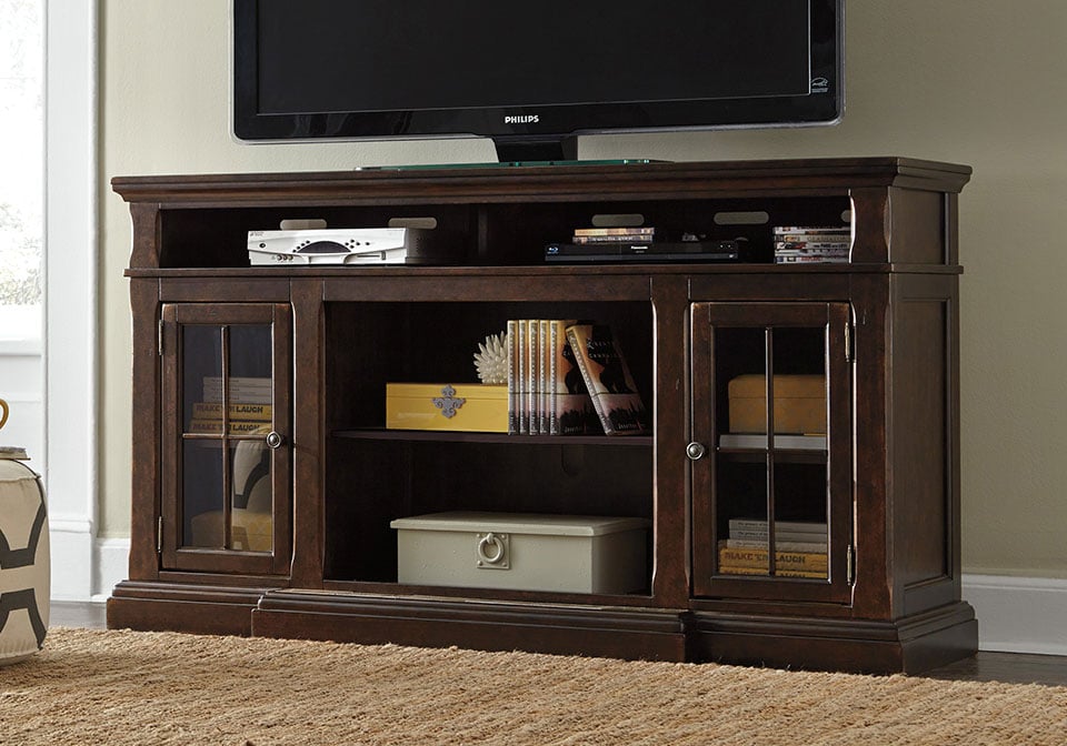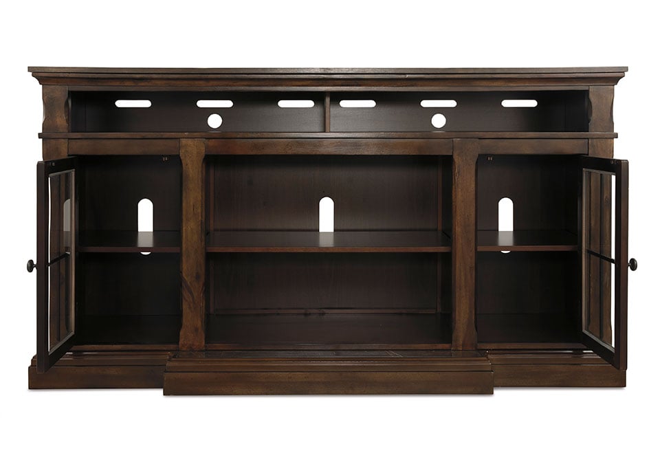The beauty of this TV stand will immediately engage you. The slight breakfront shape is a rare find and an ideal fit among traditional and eclectic tastes. Soft black undertones highlight the warm finish. Multiple cubbies and glass-door enclosed shelves organize your audio/video components and plenty of extras. Sold separately, an electric fireplace fits neatly in the center cubby.