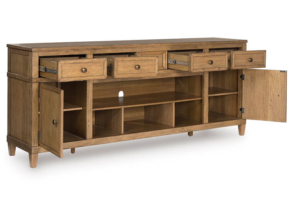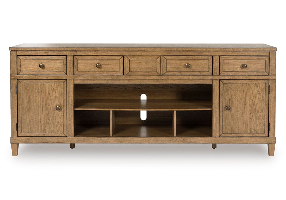 Taking a timeless approach to casual beauty, this TV stand brings easygoing elegance to the everyday. The light brown wood-tone finish seamlessly slips into your room’s aesthetic. Two spacious cabinets (each with an adjustable shelf), four drawers and an open center shelf offer plenty of storage for media and electronics. Enhancing the experience: the optional fireplace insert (sold separately) brings a touch of warmth and beautiful ambiance to your living room.