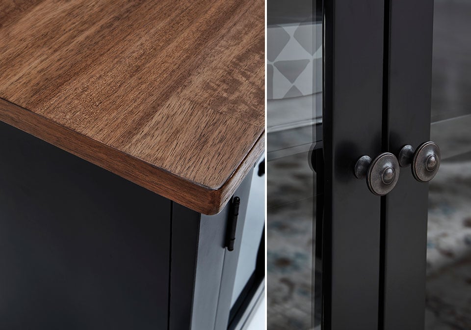 Raise the bar on modern farmhouse style with this TV stand with electric fireplace. Its sturdy silhouette and casual good looks are accentuated with a two-tone finish, which pairs a warm satin black base with a contrasting butcher block veneer top. Glass door cabinets with adjustable shelves offer plenty of storage for media and electronics. Adding that much more show-stopping style, the electric fireplace insert operates with or without heat and includes a six-level temperature setting, a remote control and an overheating control for added safety. It comes with faux glass crystals and natural stones, so you can customize the look of the flame bed.