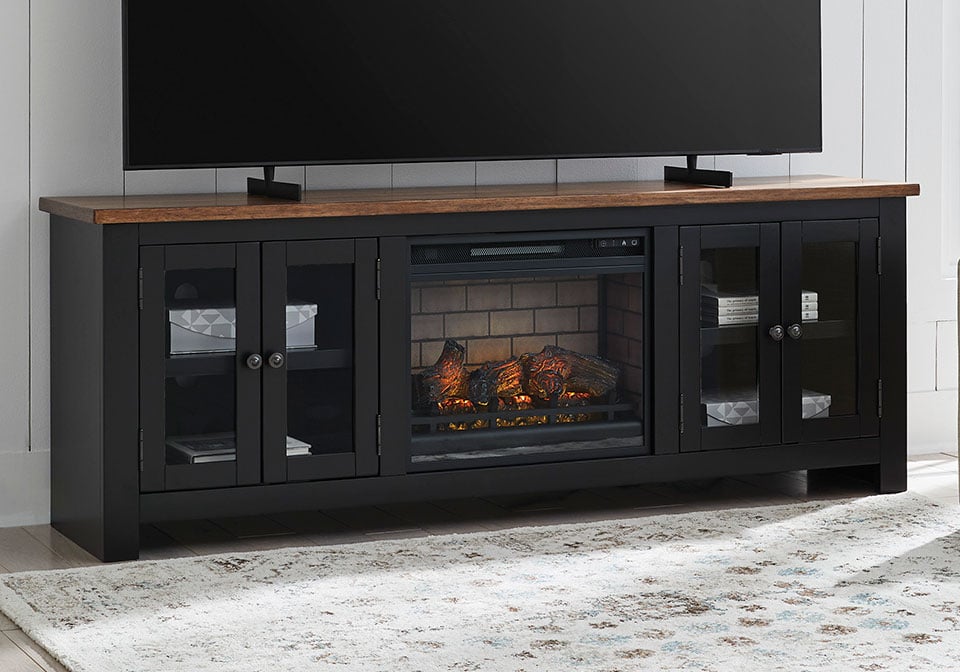 Raise the bar on modern farmhouse style with this TV stand with electric fireplace. Its sturdy silhouette and casual good looks are accentuated with a two-tone finish, which pairs a warm satin black base with a contrasting butcher block veneer top. Glass door cabinets with adjustable shelves offer plenty of storage for media and electronics. What really turns up the heat: an electric infrared fireplace insert with faux firebrick surround that operates with or without infrared heat. With the touch of a button, adjust the temperature and the flame brightness, and set the timer for long-lasting enjoyment.