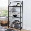 Classic design effortlessly blends with modern functionality in this elegant bookcase. Its antiqued bronze-tone finish adds a touch of warmth and sophistication, while the clear glass shelves create an airy and spacious feel. It’s exactly what you’ve been searching for to display your treasured books, digital picture frames or decorative accents.