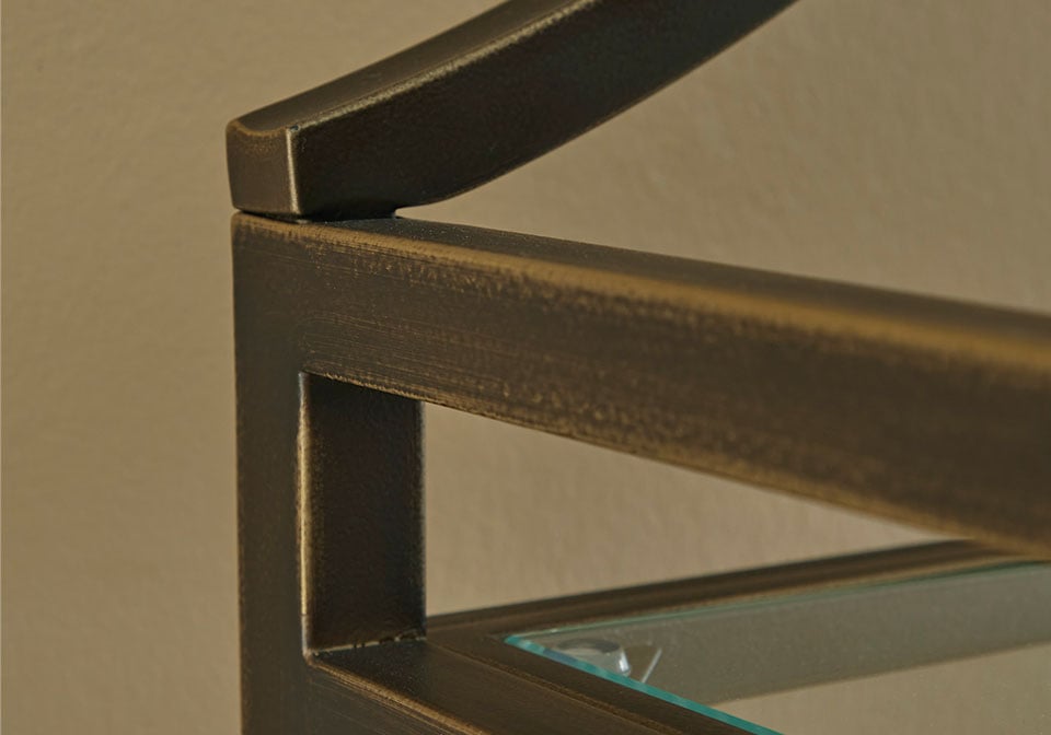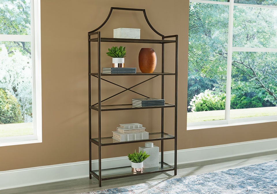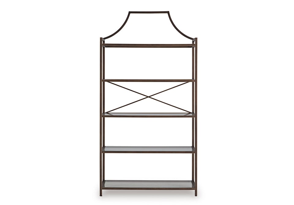 Classic design effortlessly blends with modern functionality in this elegant bookcase. Its antiqued bronze-tone finish adds a touch of warmth and sophistication, while the clear glass shelves create an airy and spacious feel. It’s exactly what you’ve been searching for to display your treasured books, digital picture frames or decorative accents.