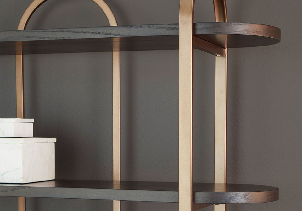 With its mixed-material look, this bookcase seamlessly fits into a wide range of modern settings. Five fixed display shelves in a dark brown finish are balanced by sleek antiqued goldtone metal supports. Offering storage and superior style for books or showcasing decor, this bookcase is a masterful way to stay organized.