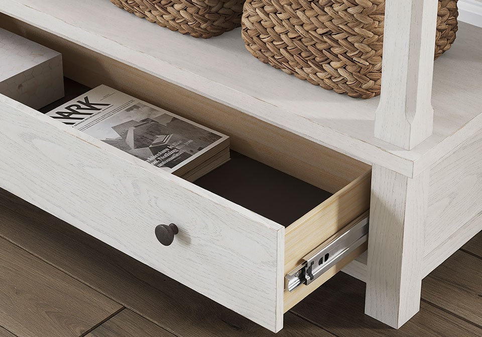 This bookcase is sure to impress when it’s time to study or work from home. With its antiqued white finish and wood grain texture, modern farmhouse-style workstations have never been so fashionable. The open four-shelf design is ideal for storage and displaying your treasures. And that large storage drawer brings even more function to your workspace. All that’s missing is you.