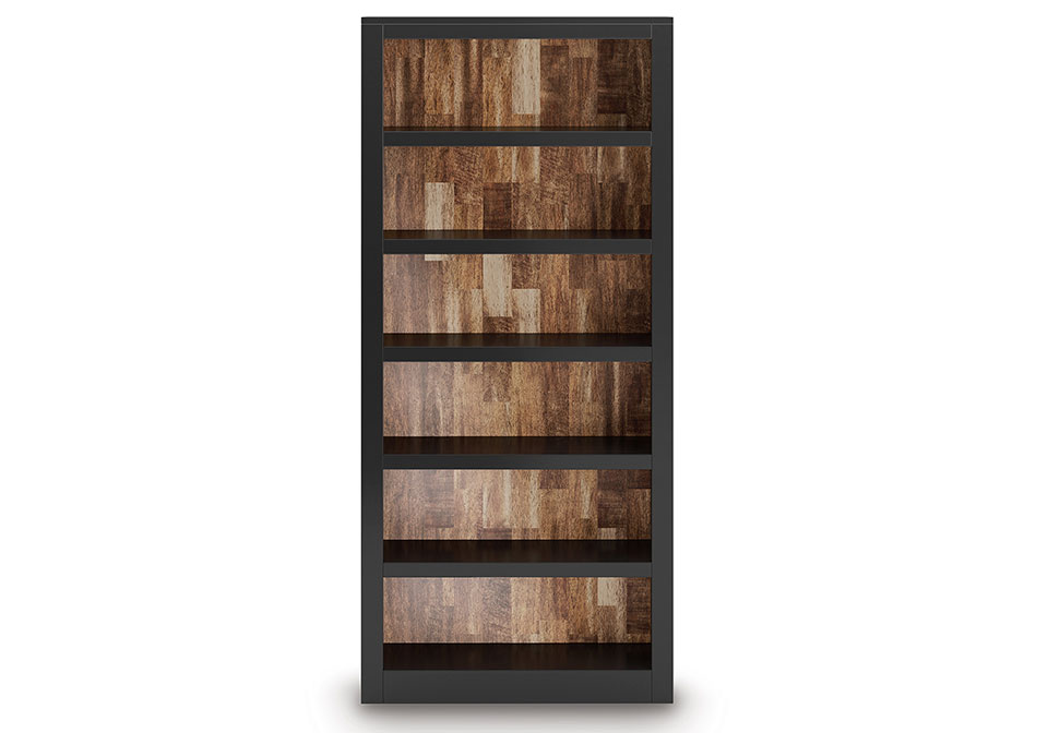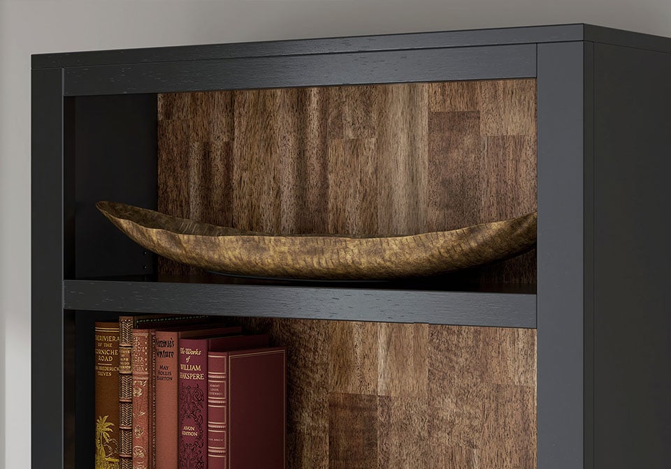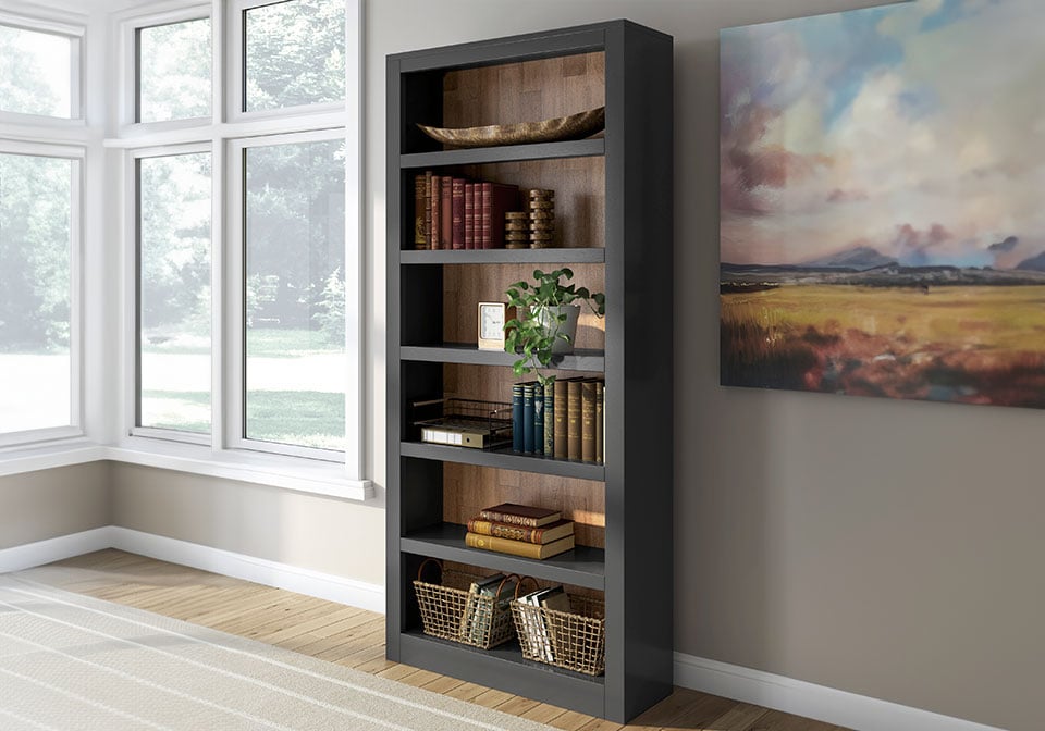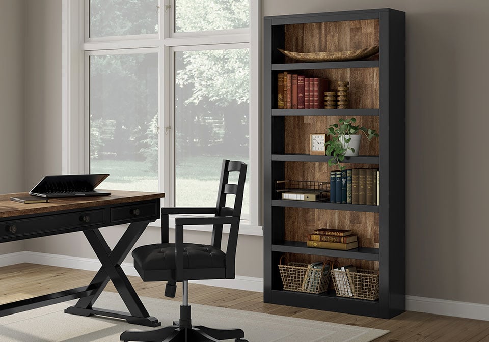 Raise the bar on modern farmhouse style with this home office bookcase. Its casual good looks are accentuated with a two-tone finish, which pairs a warm satin black with a butcher block veneer back in a contrasting rich brown wood tone. Six shelves—four of which are adjustable to fit your needs—are perfect for storage and displaying decor, bringing both form and function to your office.