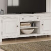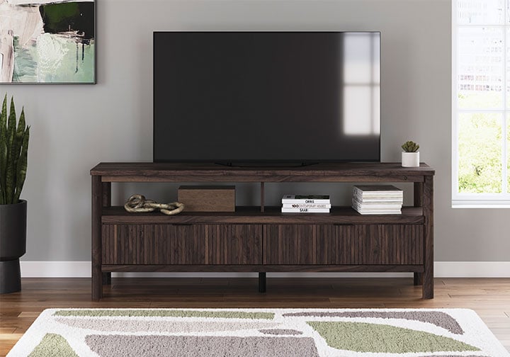 Crafted with both form and function in mind, this TV stand brings a dash of retro-cool character to your modern boho aesthetic. A reeded design on its drawers adds an on-trend touch to storing entertainment essentials. Warmly welcoming with a rich brown finish, the TV stand pairs well with muted hues, earth tones and other neutrals alike. And for added ambiance, lighting under the top brings a cool vibe to your favorite shows or video gaming. What a refined take on easygoing style.