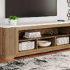 Elegance meets earthy charm in this TV stand with electric fireplace. Crafting a contemporary living room? The faux marble top expertly pairs with the reeded base for a trend-right take on day-to-day function. Open shelving and subtly integrated storage cabinets make it easy to store and display media accessories in style. For your added viewing pleasure, the wide fireplace insert gives you the cozy feel of a fireplace without the added hassle. With the touch of a button, adjust the temperature and the color-changing flames, and set the timer for long-lasting enjoyment. It comes with faux glass crystals and natural stones, so you can customize the look of the flame bed.