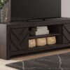 This TV stand with electric fireplace embraces a classically charming aesthetic and repurposes it for modern living. Its dark charcoal finish appeals to your love of vintage character, while a chic chevron pattern is effortlessly on trend. Media accessories stay tucked away in style thanks to hidden storage behind the doors. And for added ambiance, the electric fireplace brings a cozy-cool vibe to your living room. With the touch of a button, activate the LED-lit flame and adjust the temperature or the flame brightness. The flame effect includes multiple color options and a realistic-looking faux birch log set.