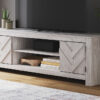 This TV stand with electric fireplace embraces a classically charming aesthetic and repurposes it for modern living. Its whitewash replicated paint appeals to your love of vintage character, while the chic chevron pattern is effortlessly on trend. Media accessories stay tucked away in style thanks to hidden storage behind the doors. And for added ambiance, the electric fireplace brings a cozy-cool vibe to your living room. With the touch of a button, activate the LED-lit flame and adjust the temperature or the flame brightness. The flame effect includes multiple color options and a realistic-looking faux birch log set.