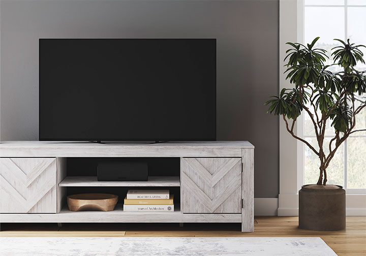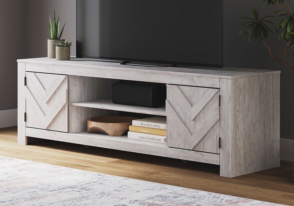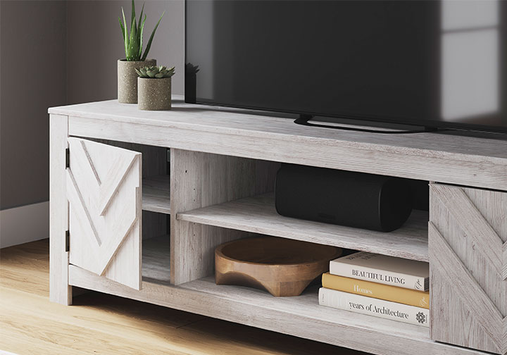 This TV stand embraces a classically charming aesthetic and repurposes it for modern living. Its whitewash replicated paint appeals to your love of vintage character, while the chic chevron pattern is effortlessly on trend. And with hidden storage behind the doors, your media accessories stay tucked away in style.