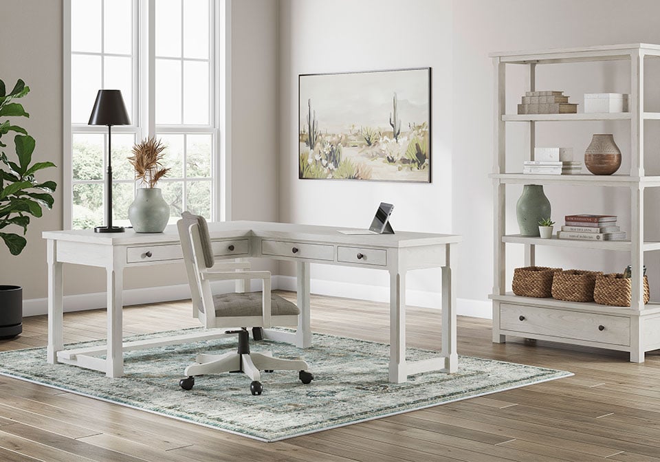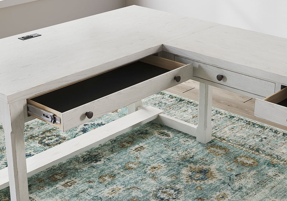 This L-shaped home office desk is sure to impress when it’s time to study or work from home. With its antiqued white finish and wood grain texture, modern farmhouse-style workstations have never been so fashionable. A wide keyboard drawer and convenient USB charging bring function galore to your at-home office. The desk return expands your workspace and adds spacious drawers to keep all your stuff organized. All that’s missing is you.
