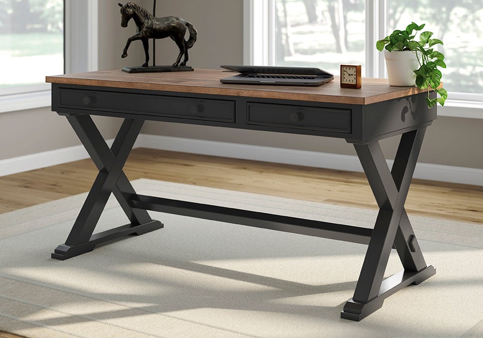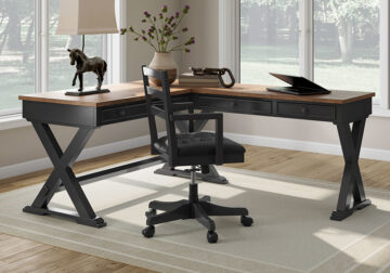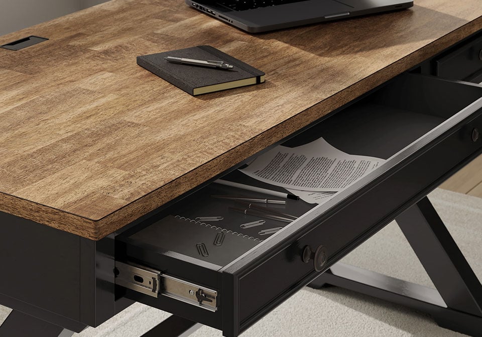 Raise the bar on modern farmhouse style with this home office desk. Its casual good looks are accentuated with a two-tone finish, which pairs a warm satin black base with a contrasting butcher block veneer desktop. The drop-down keyboard and cord management raceway bring both form and function to your at-home workspace. Use this desk as a stand-alone work area, or combine it with the matching desk return (sold separately) to create a larger work surface.