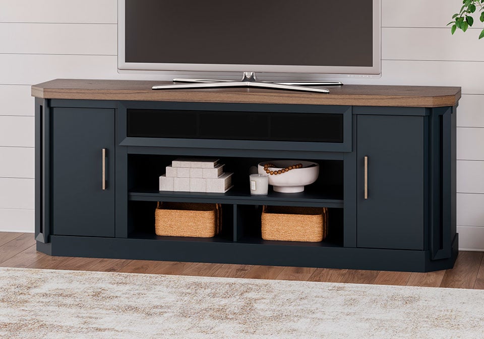 This TV stand combines casual contemporary design with modern appeal. Its combination of a thick-bodied wood-tone top with a slate blue cabinet is a smart choice on so many levels. Stow away electronics in the roomy cabinets, and use the upper shelf to conceal a soundbar speaker for a clean integrated look. Enhancing the experience: the optional fireplace insert (sold separately) brings a touch of warmth and beautiful ambiance to your living room.