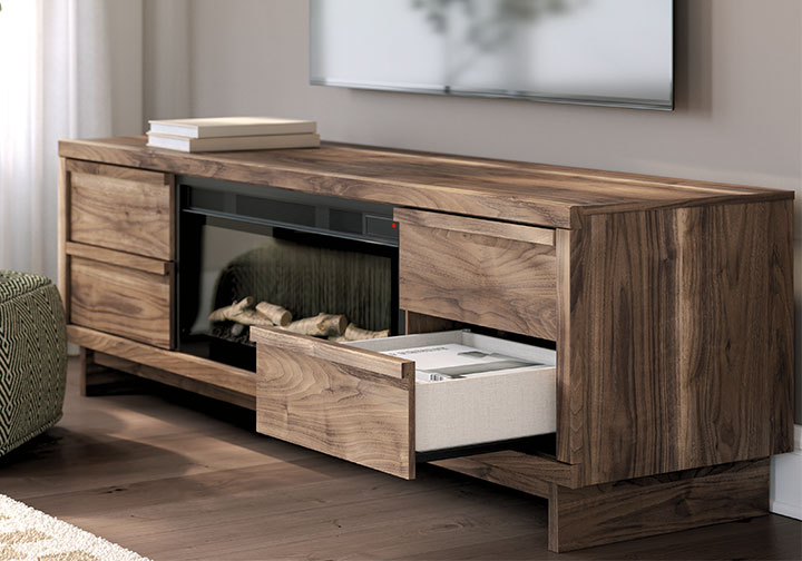 Nostalgic style, retooled for today’s trends. This TV stand with electric fireplace puts an elevated twist on mod aesthetics. Its warm brown tones reflect the mid-century vibes you love, while the angular base incorporates contemporary motifs. Integrated drawer handles round out the look in sleek style. For added ambiance, the electric fireplace brings a cozy-cool vibe to your living room. With the touch of a button, activate the LED-lit flame and adjust the temperature or the flame brightness. The flame effect includes multiple color options and a realistic-looking faux birch log set.