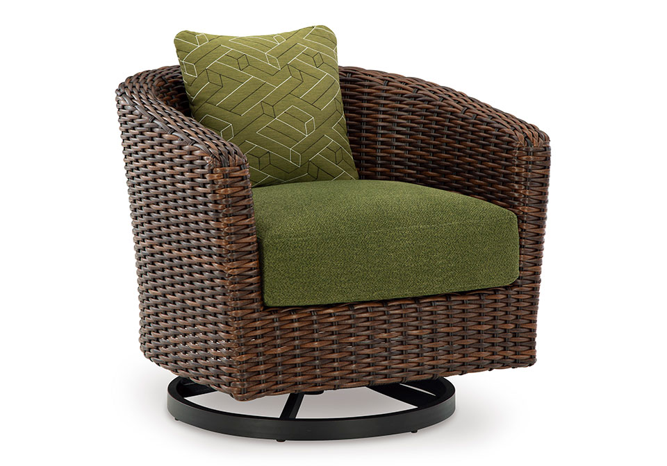 This outdoor swivel lounge chair recalls the aesthetics of nature to bring an inviting, high-style feel to your patio or lanai. Its Nuvella+™ performance fabric is made with enhanced UV resistance, so the chic green hue stays brighter for longer. Worried about the weather? Don’t sweat it—the durable resin wicker withstands the elements from season to season.