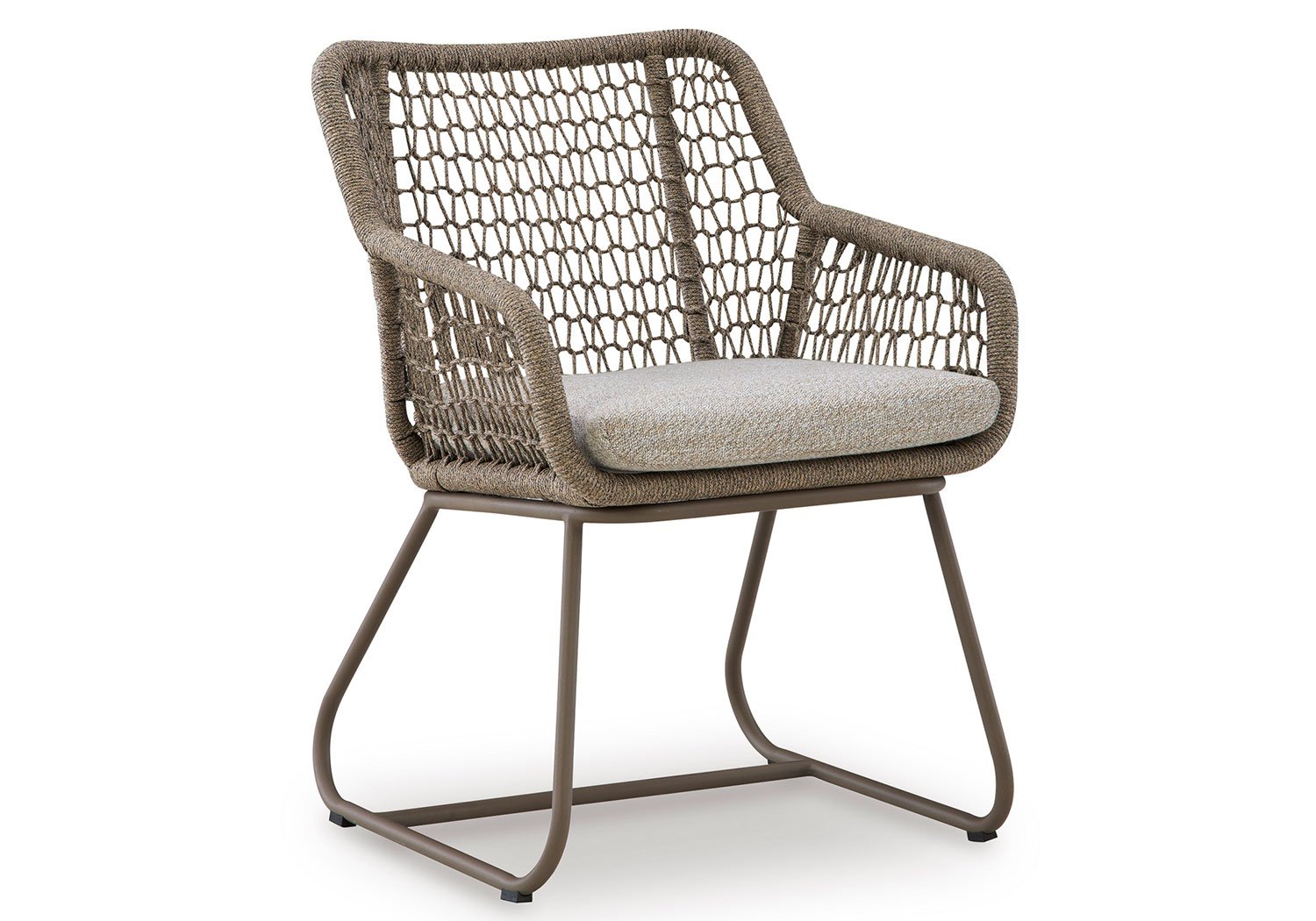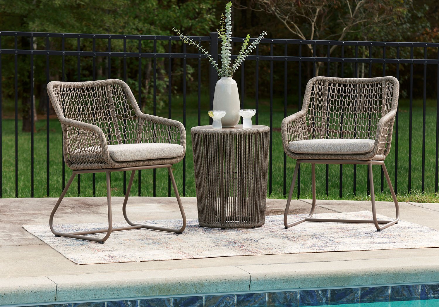On-trend style, made for outdoor living. This outdoor table and chair set impresses with its contemporary vibe and durable construction. Detailed rope designs on sturdy aluminum frames make a chic impression. And with UV-resistant performance fabric, the cushions stay vibrant as they weather the elements.