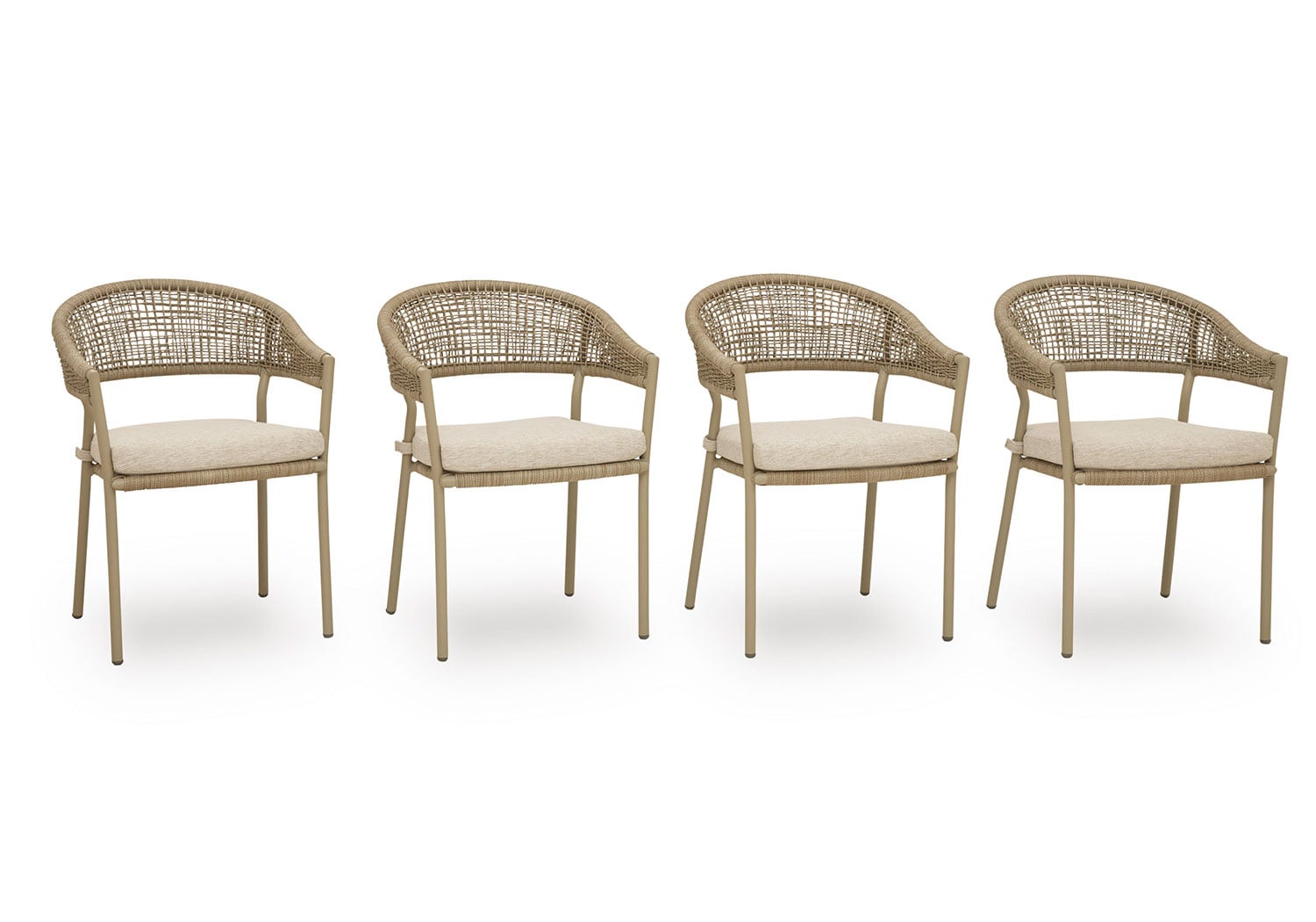 Whether decking out your deck or patio or making a splash by the pool, this outdoor arm chair with cushion is all about easy-breezy outdoor living. Its gently curved back features a nicely neutral polyester rope wrap over a sturdy, rust-resistant aluminum frame that’s sure to weather the seasons beautifully. The cushion is covered in high-performance Nuvella® fabric that withstands the elements and is oh-so-easy to clean.