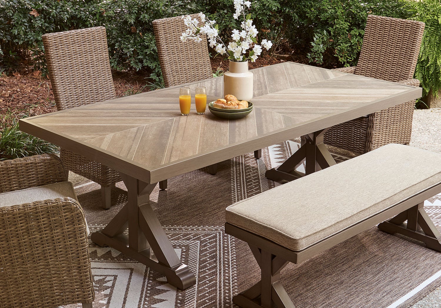 Who says the great outdoors isn’t made for luxury living? This outdoor dining Series offers all of the high-end design and durability you could ask for, and then some. Its all-weather, rust-resistant aluminum frame provides the easy-breezy look you love without the high maintenance. Rest assured—with this Series, you can focus less on upkeep and more on relaxation.