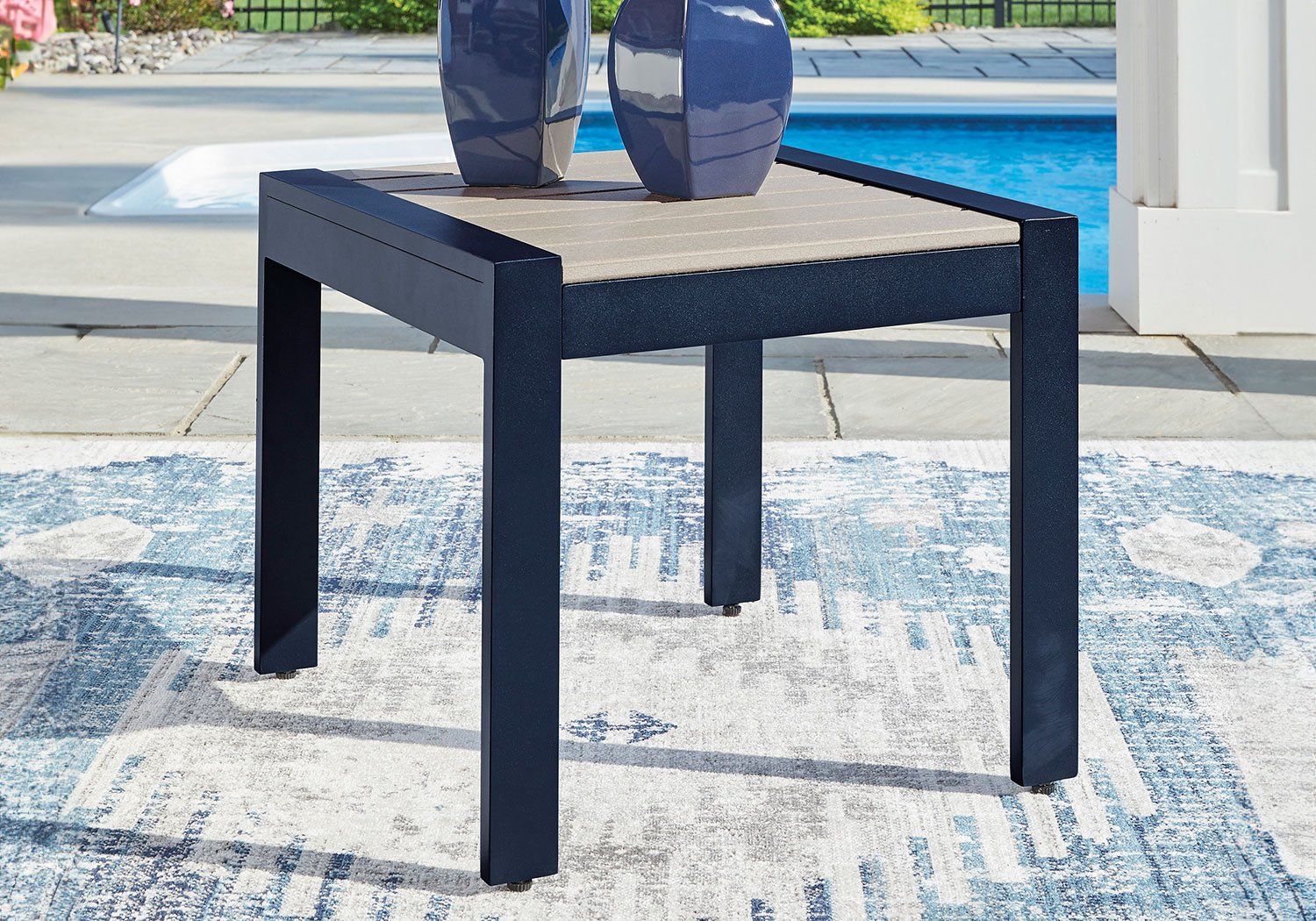 Easy-breezy beauty, made to withstand the elements. This outdoor end table makes a serene statement with its soothing shade of blue and contrasting wood-look top. Crafted with durable materials for added longevity, it’s a smartly stylish addition to your outdoor oasis.