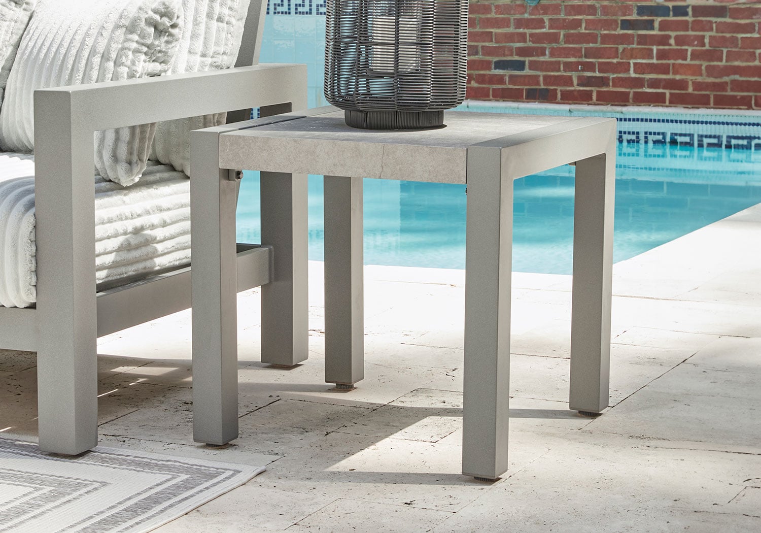 Indulge in luxe outside living without sacrificing longevity. This outdoor end table combines natural beauty with a sleek aluminum frame. Soak up the sun poolside or on the porch—it’s the perfect perch for your drink or latest read. And with a chic gray stone tabletop, style and durability go hand in hand.