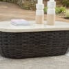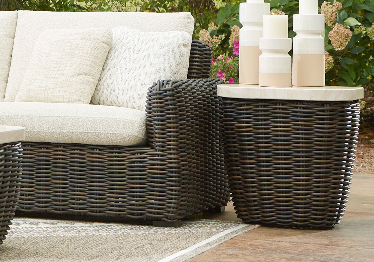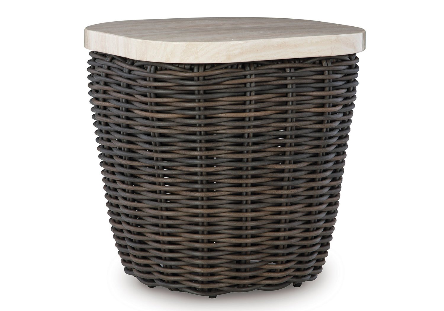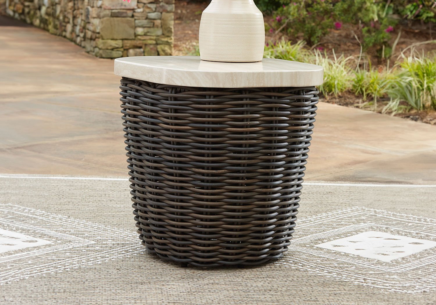 Add luxury, convenience and durability to alfresco fun. This outdoor end table captures the textural beauty of wicker while withstanding the elements, from rain to shine. With its marble-look aluminum top, you can stylishly keep your pool-side drinks or reads in reach.