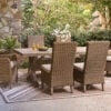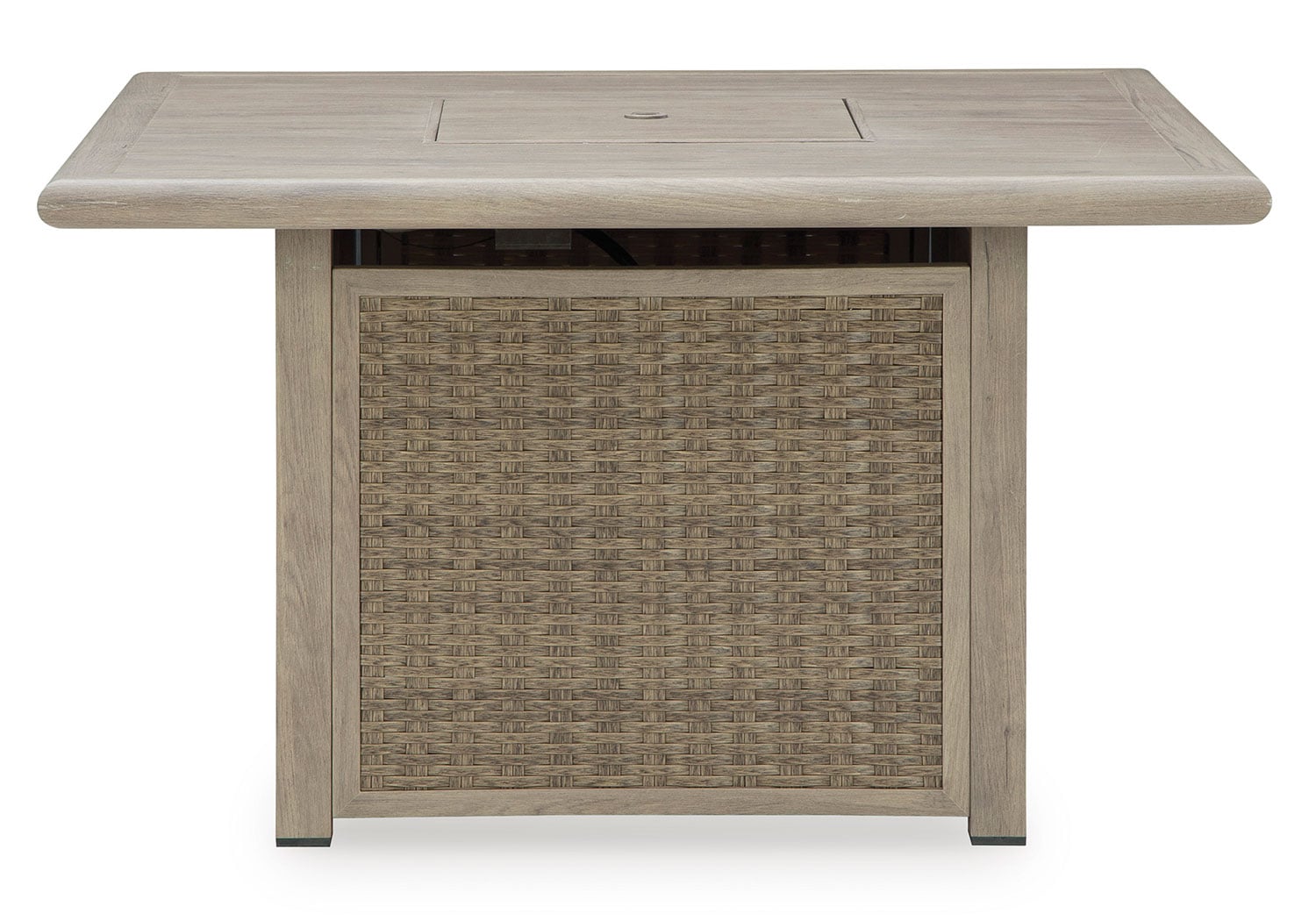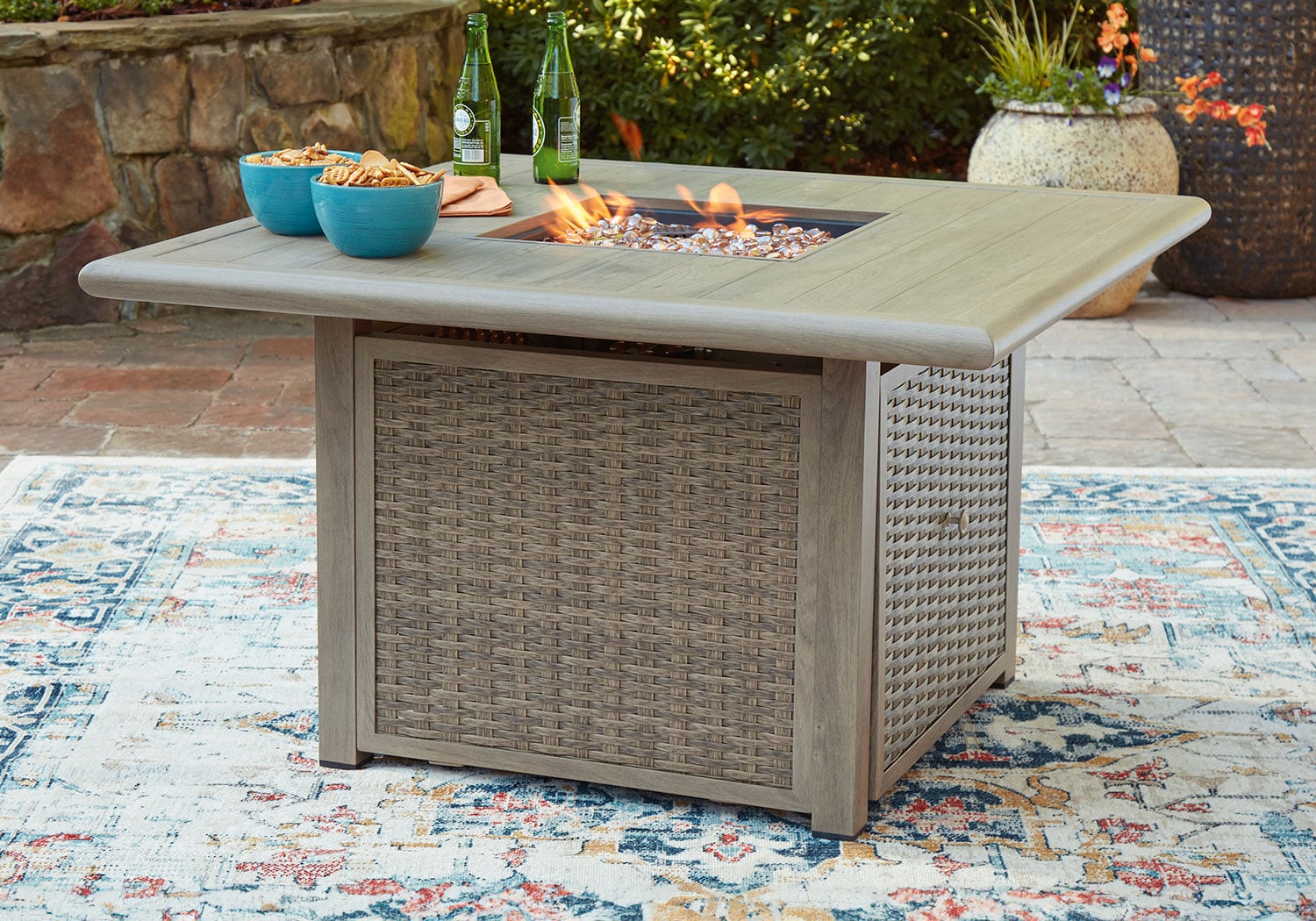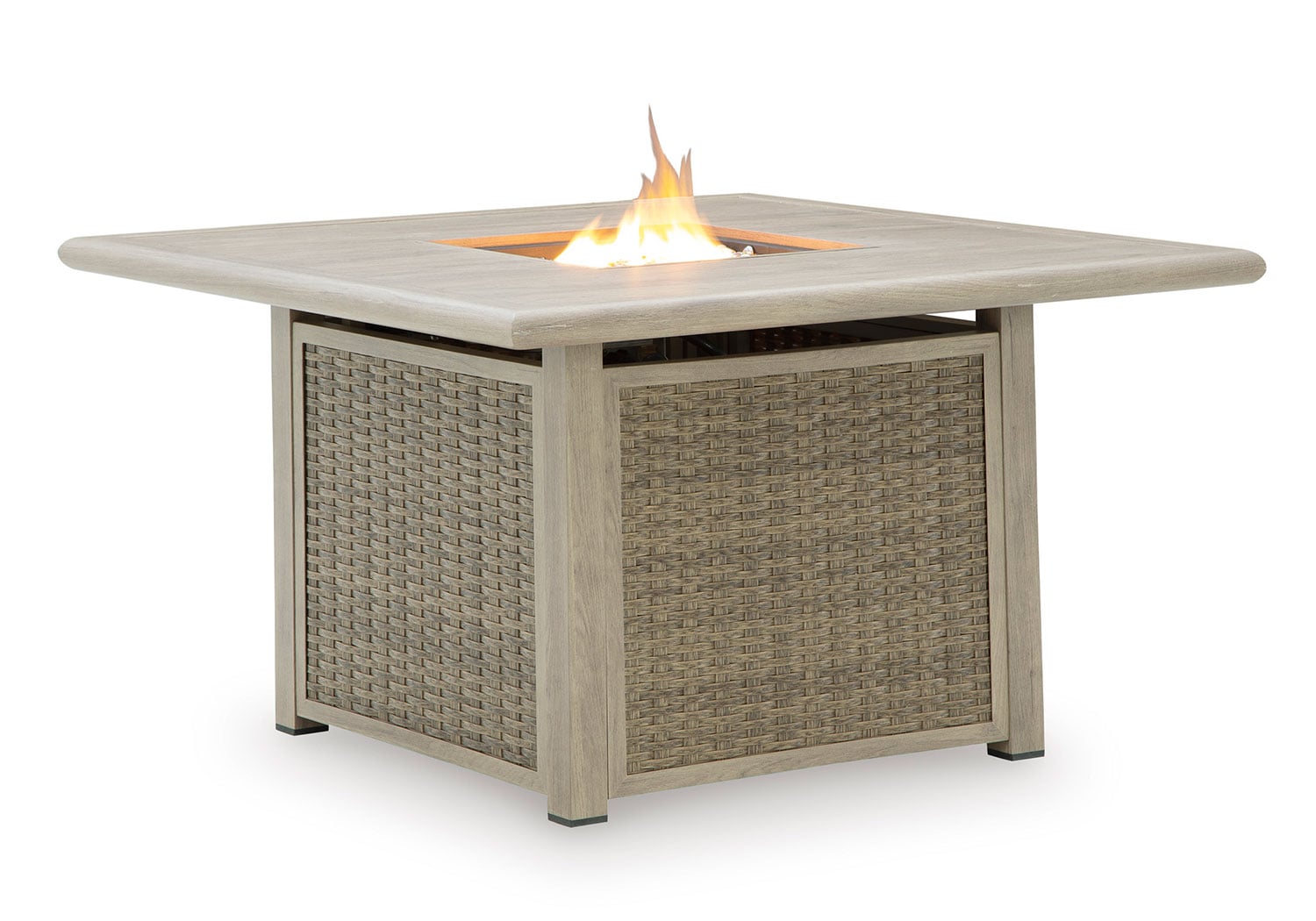 Includes gas fire pit table with CSA-approved 50,000 BTU stainless steel burner, glass beads and all-weather protective cover. All-weather resin wicker handwoven over rust-free aluminum frame with durable powder coated finish. Aluminum top. Stainless steel hardware. Cabinet door conceals gas propane tank (not included). Battery-operated ignition system with adjustable flame control; battery included. Gas line or propane tank connector hose not provided.