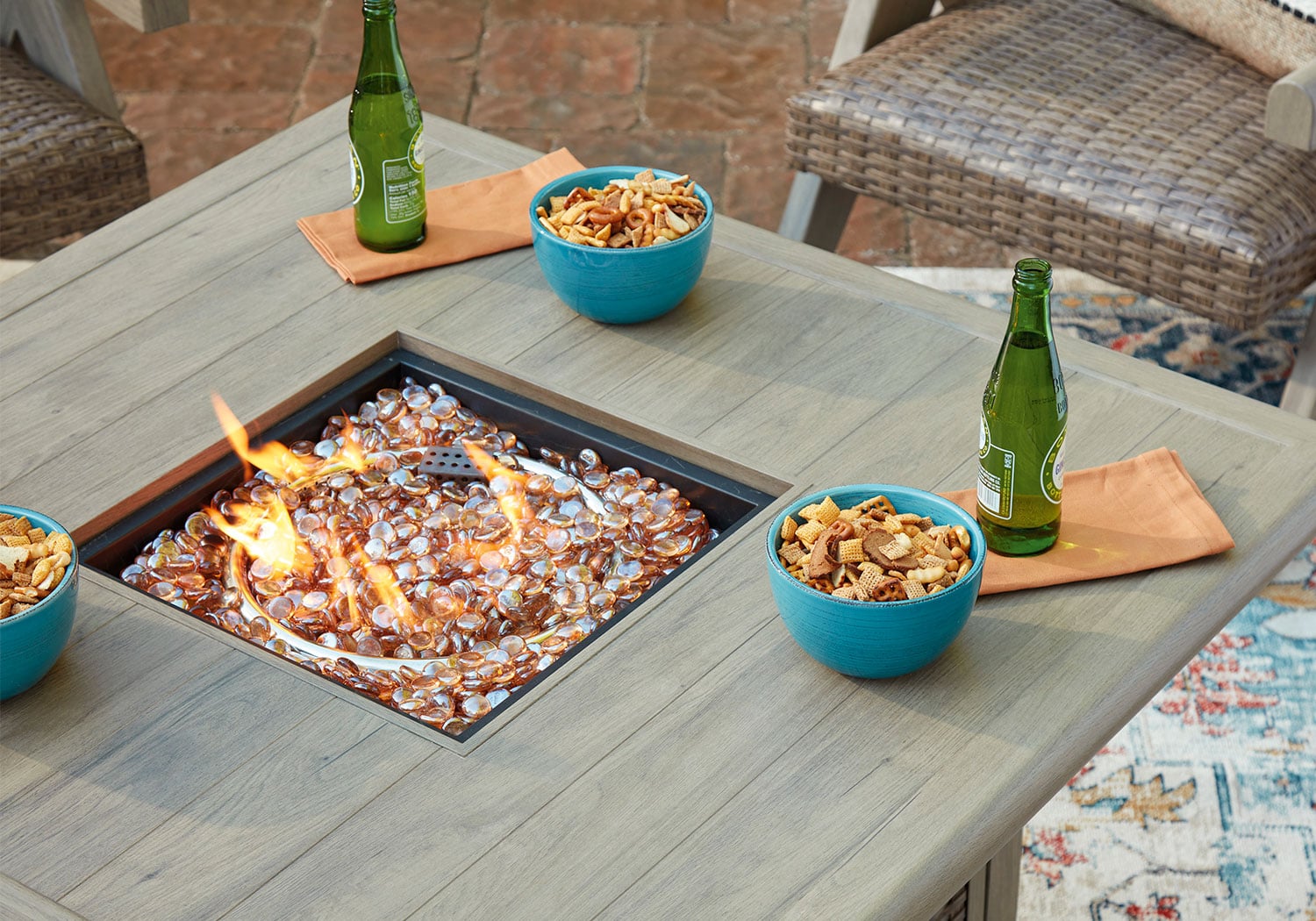 The naturally beautiful look of wood. The convenience of a crackling fire. And did we mention durability? This fire pit table set is crafted with elevated style and everyday function in mind. With sturdy aluminum construction and a protective cover, it withstands the weather while making a chic statement on your deck or patio. A simple press of the button quickly ignites the flame, so you can get to enjoying warm summer evenings or cozy winter nights.