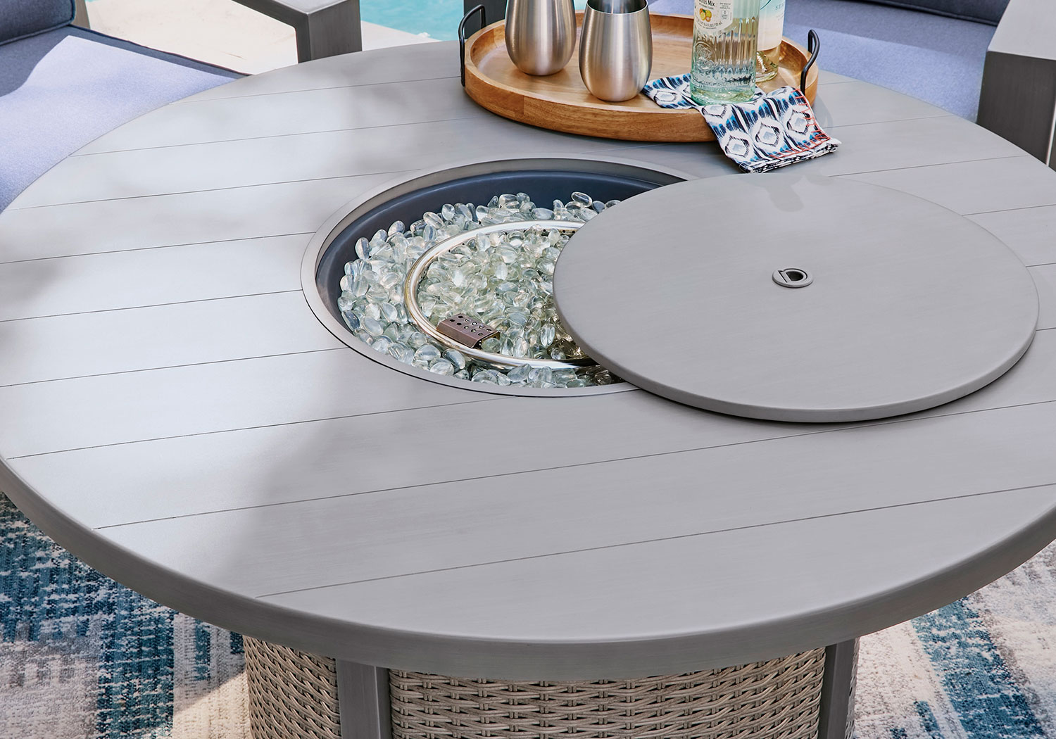 High style crafted for low-maintenance living. Turn your outdoor space into a sweet retreat with this fire pit table. The casually cool piece entices with easy-breezy gray resin wicker over an all-weather aluminum frame, for an upscale aesthetic that’s downright durable. A stainless steel burner with glass beads adds a captivating element sure to wow. Gather round for mealtime, morning coffee chats or cocktails in the great outdoors.