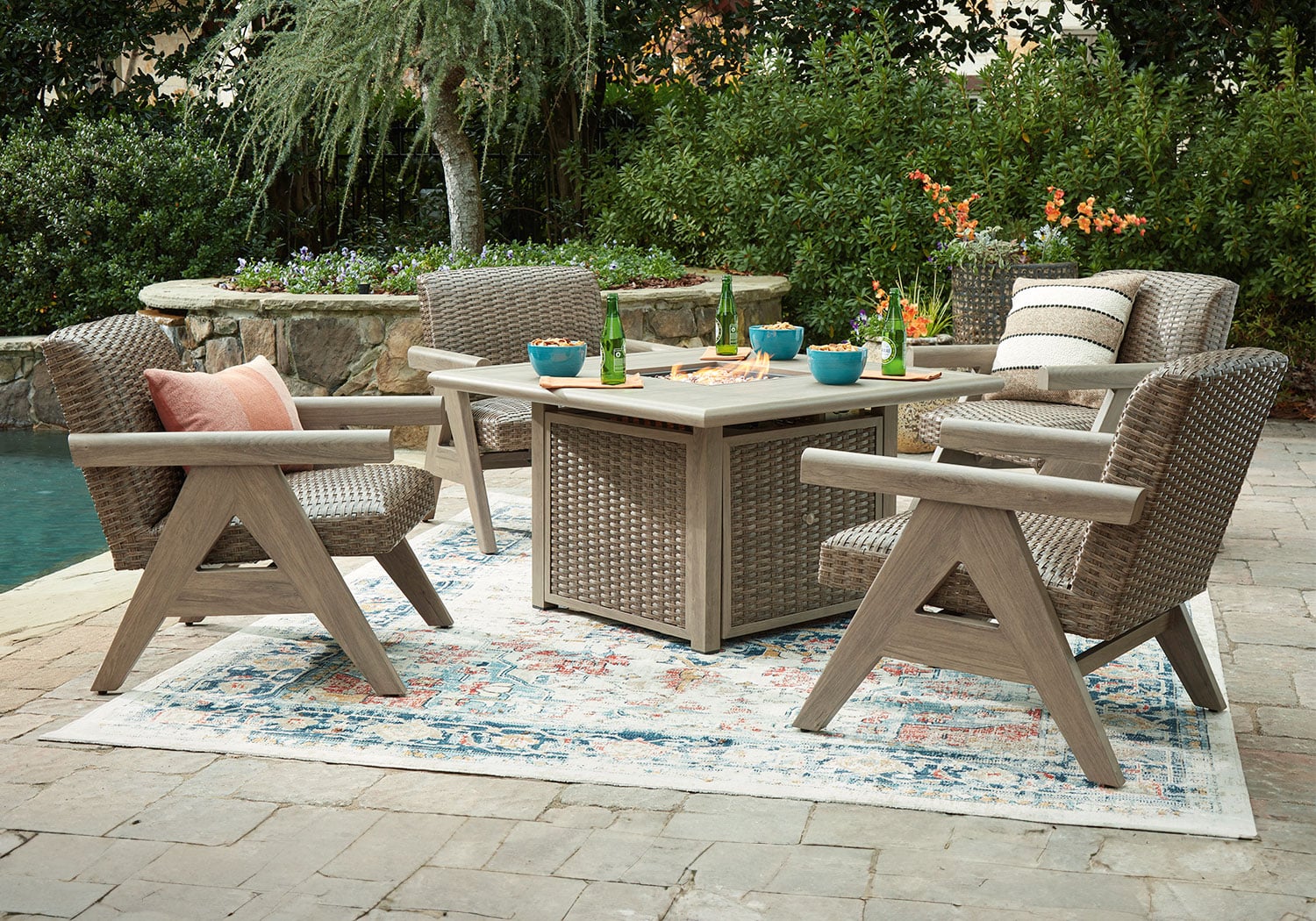 Includes gas fire pit table with CSA-approved 50,000 BTU stainless steel burner, glass beads and all-weather protective cover. All-weather resin wicker handwoven over rust-free aluminum frame with durable powder coated finish. Aluminum top. Stainless steel hardware. Cabinet door conceals gas propane tank (not included). Battery-operated ignition system with adjustable flame control; battery included. Gas line or propane tank connector hose not provided. Rocking Lounge Chairs with Quick-dry foam cushion & Gentle rocking motion.