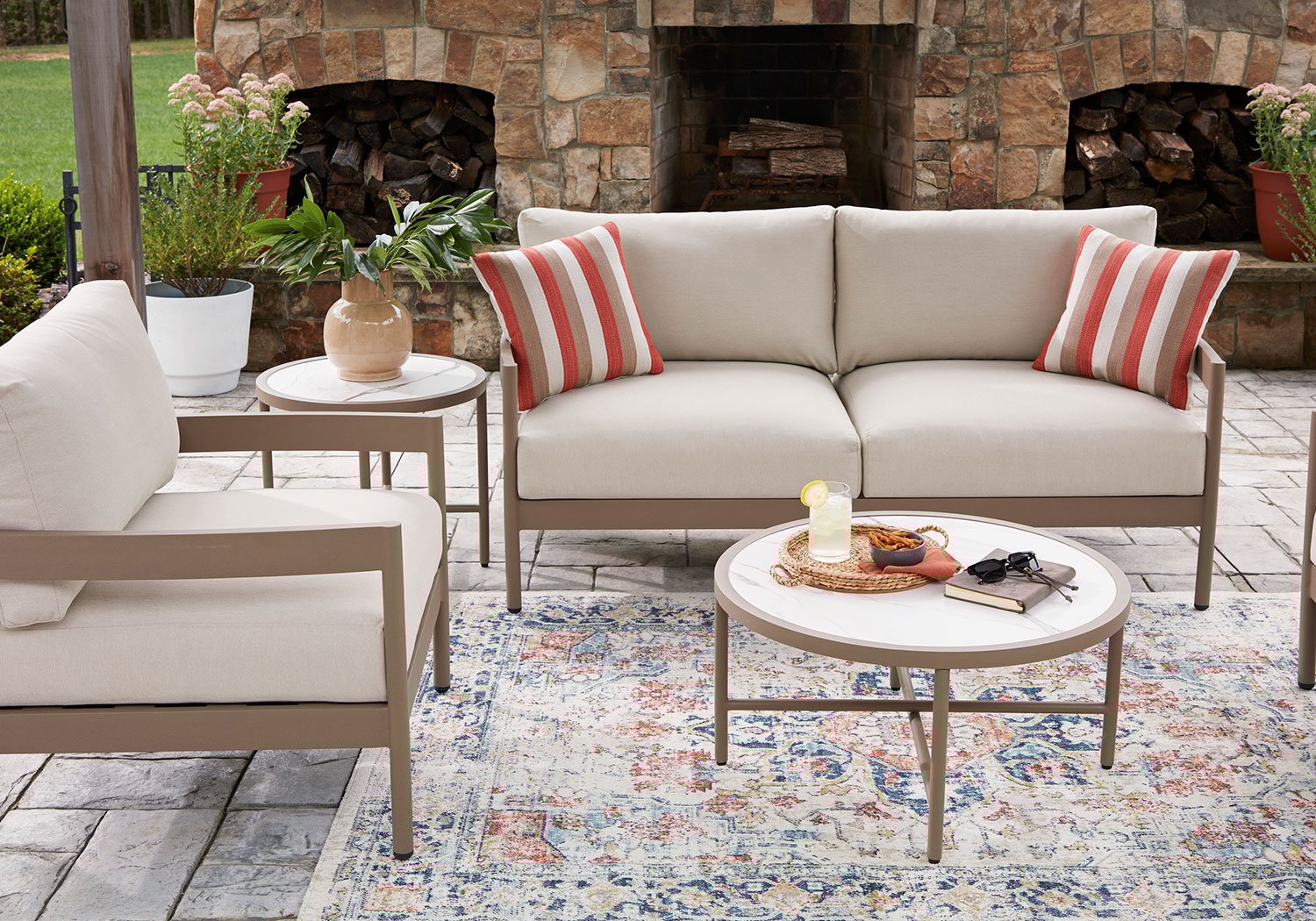 Indulgently comfortable furniture shouldn’t be limited to inside spaces. Create your own outdoor oasis with this 5-piece outdoor ensemble. It’s a study in form and function, with clean-lined, durable aluminum frames that are ready for many seasons of fun in the sun. Plush lounge chair and loveseat cushions wrapped in high-performing Nuvella® fabric are comfortable and carefree, while sintered stone tabletops lend an air of natural elegance.