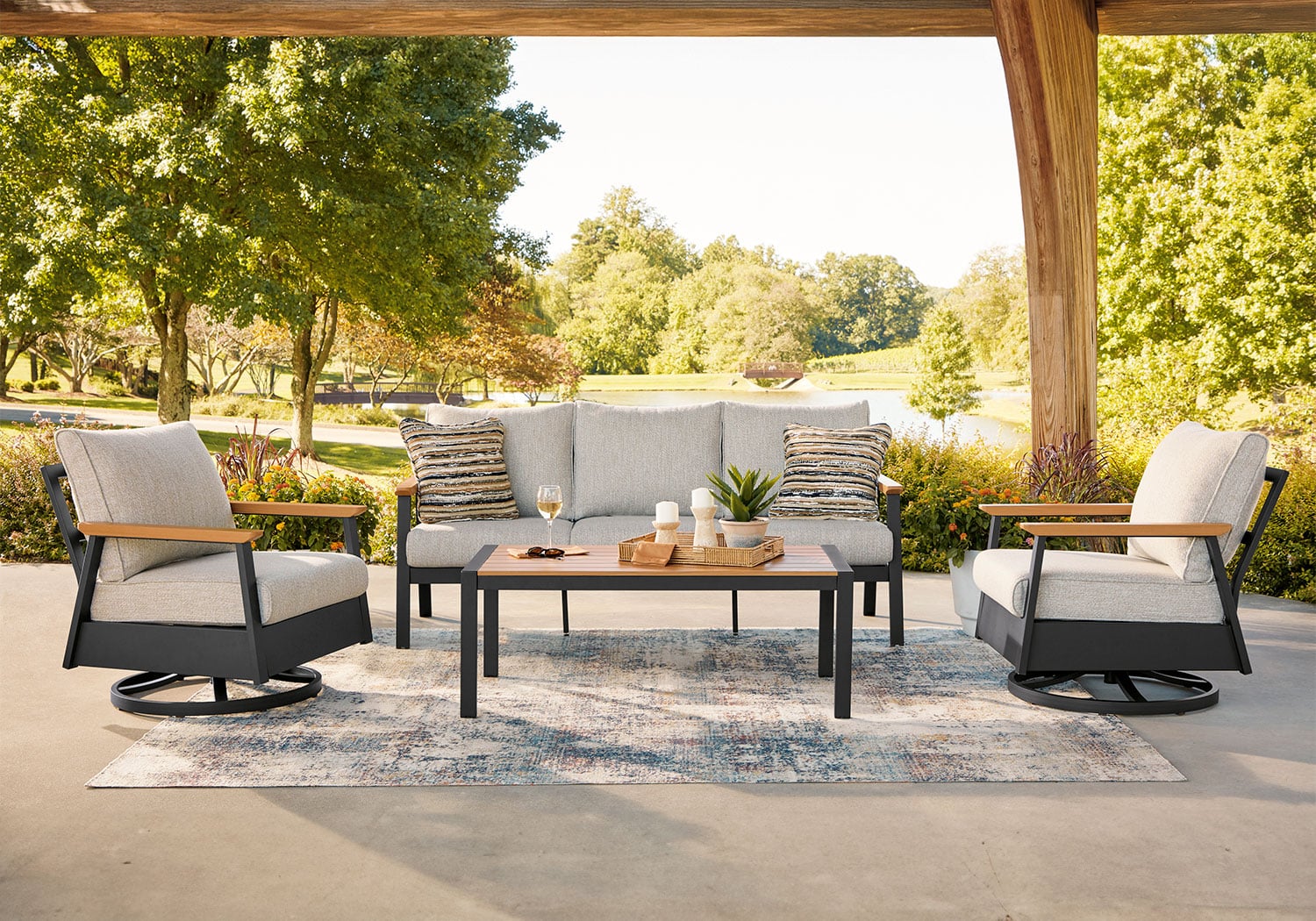 - Includes sofa, 2 swivel lounge chairs and coffee table