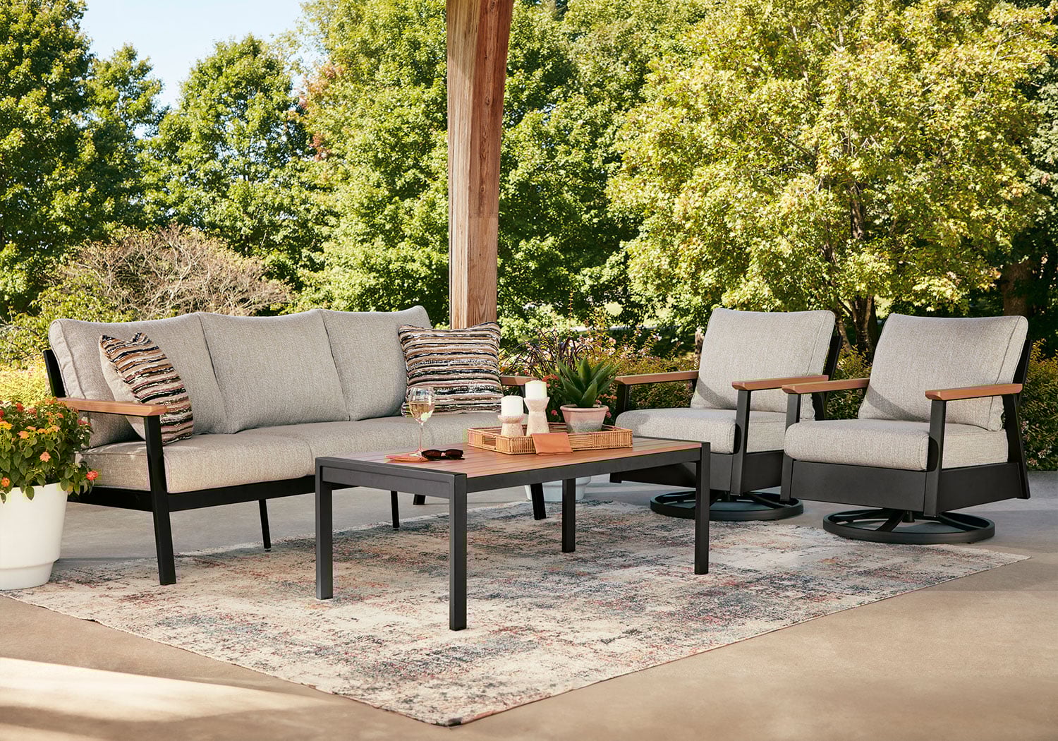 Whether you’re a morning coffee on the porch person or a nighttime read on the patio person, this outdoor sofa, chair and table set brings contemporary flair to outdoor living. Its combination of wood-look aluminum and a dark brown finish lends a neutral modern appeal. Made to weather the elements, this set expertly combines the style you love with the durability you need.