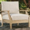 Collection features durable eucalyptus wood with an antiqued teak color paint finish. The finish is done in 5 steps: stain, sealer, glaze and 2 top-coats of paint. All with high performance Nuvella fabric.