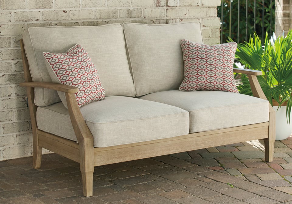 An effortlessly elegant choice in outdoor furniture, this series marries sturdiness and style in such a delightful way. For that much more weather protection, the loveseat’s eucalyptus wood frame with tapered touches and slat styling is treated to a 5-step finishing process. Sumptuously soft yet remarkably durable, the included cushions and colorful throw pillows are wrapped in a high-performing, low-maintenance Nuvella® fabric you’re sure to love.
